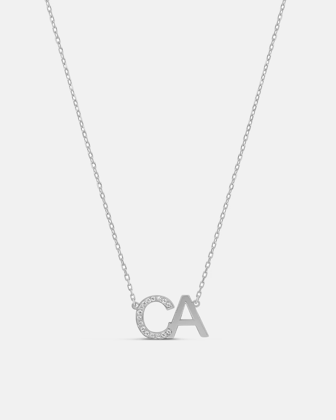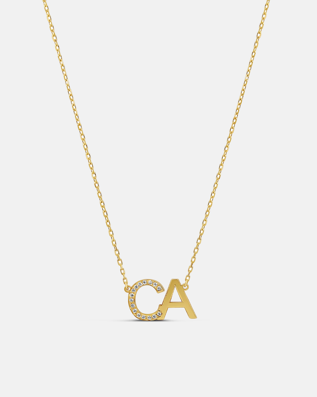 Showcase your individuality with this personalized necklace featuring two bold, uppercase initials—one shimmering with pave stones and the other in sleek solid metal. This striking combination creates a modern, eye-catching accessory that effortlessly elevates any outfit. Perfect for expressing your unique style or gifting someone special.
