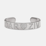 Make a lasting impression with this personalized two-name cuff, featuring a striking pave heart that boldly connects your chosen names or initials. Its unique and distinct design ensures you stand out, offering a meaningful accessory that celebrates your personal story with style and elegance.
