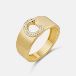 Command attention with the Personalized Wide Pave Initial Ring. This bold, wide band ring is adorned with shimmering pave stones that beautifully frame your chosen initial, creating a personalized statement piece. Perfect for adding a touch of boldness and individuality to any outfit, this ring combines standout style with meaningful customization. Make your signature shine with this must have ring.