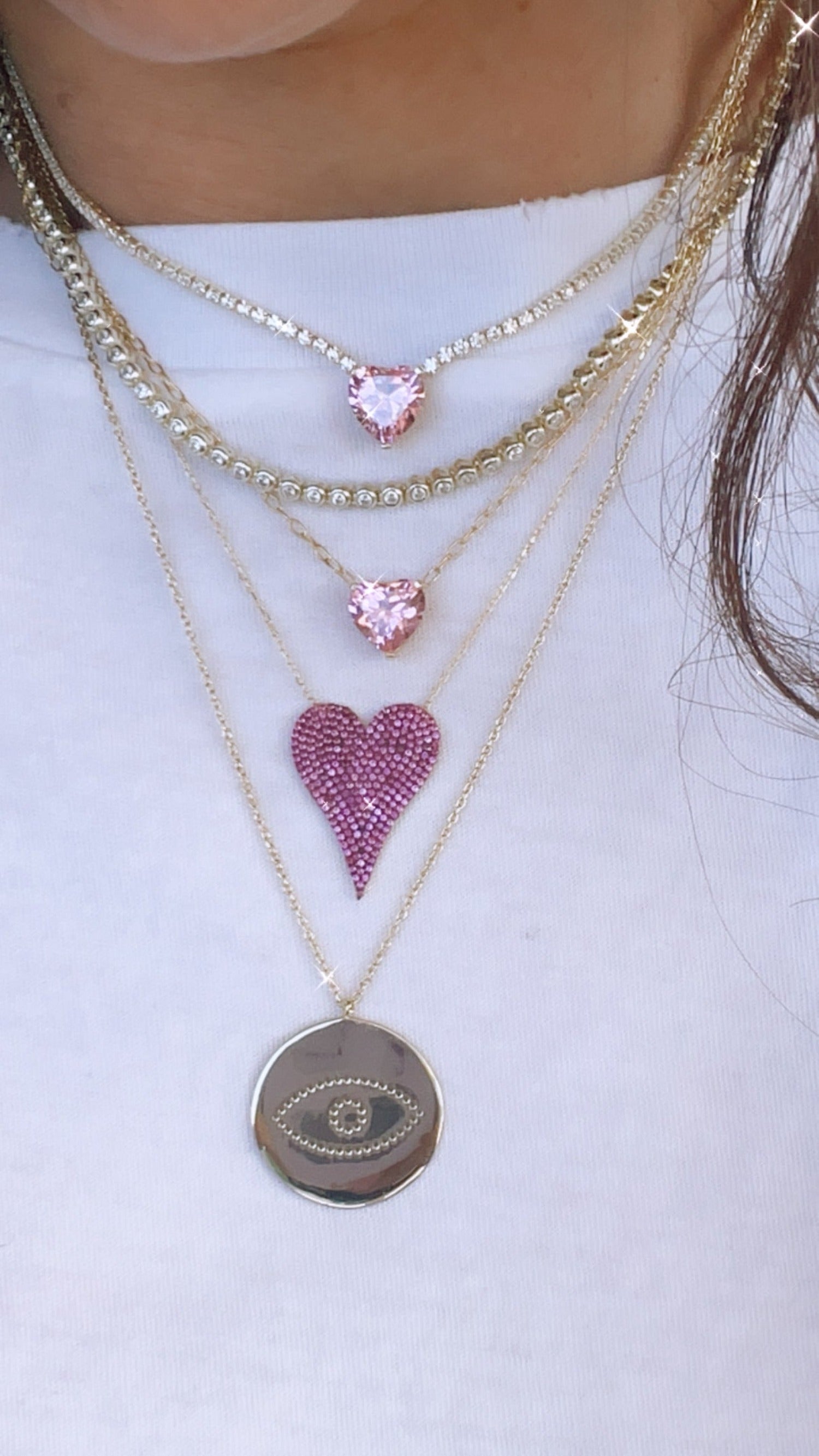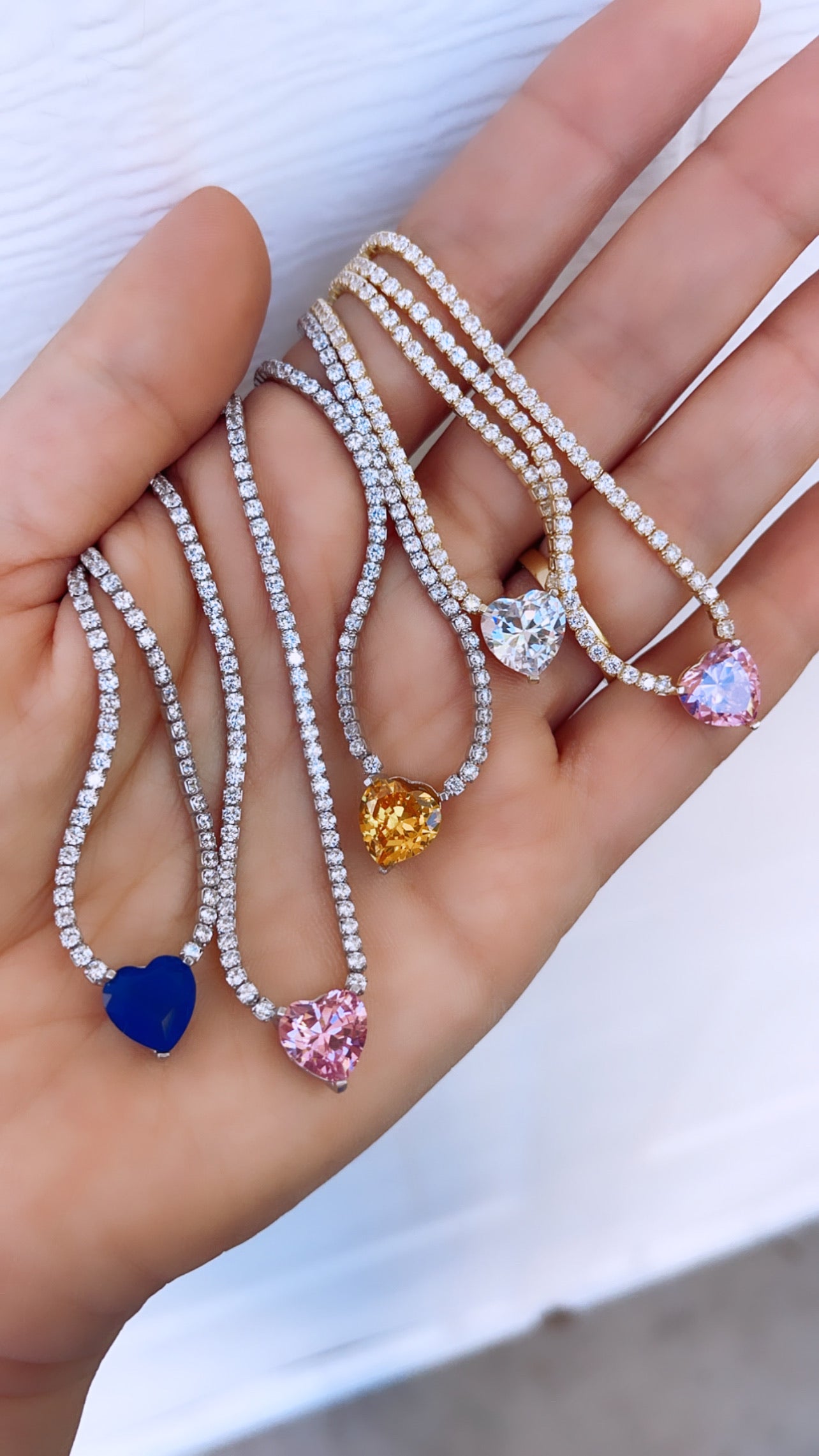 We are in love with this insanely gorgeous Fancy Heart Tennis Necklace. It is simply stunning on its own or can be layered for the perfect addition to your SHYMISTACK.