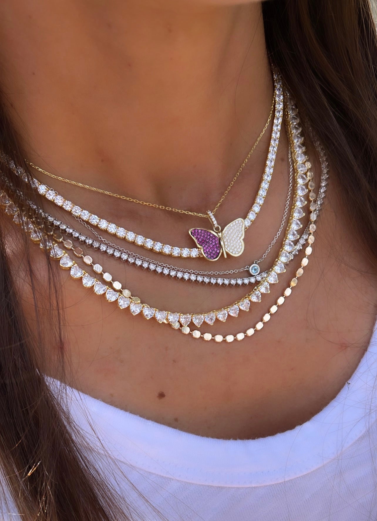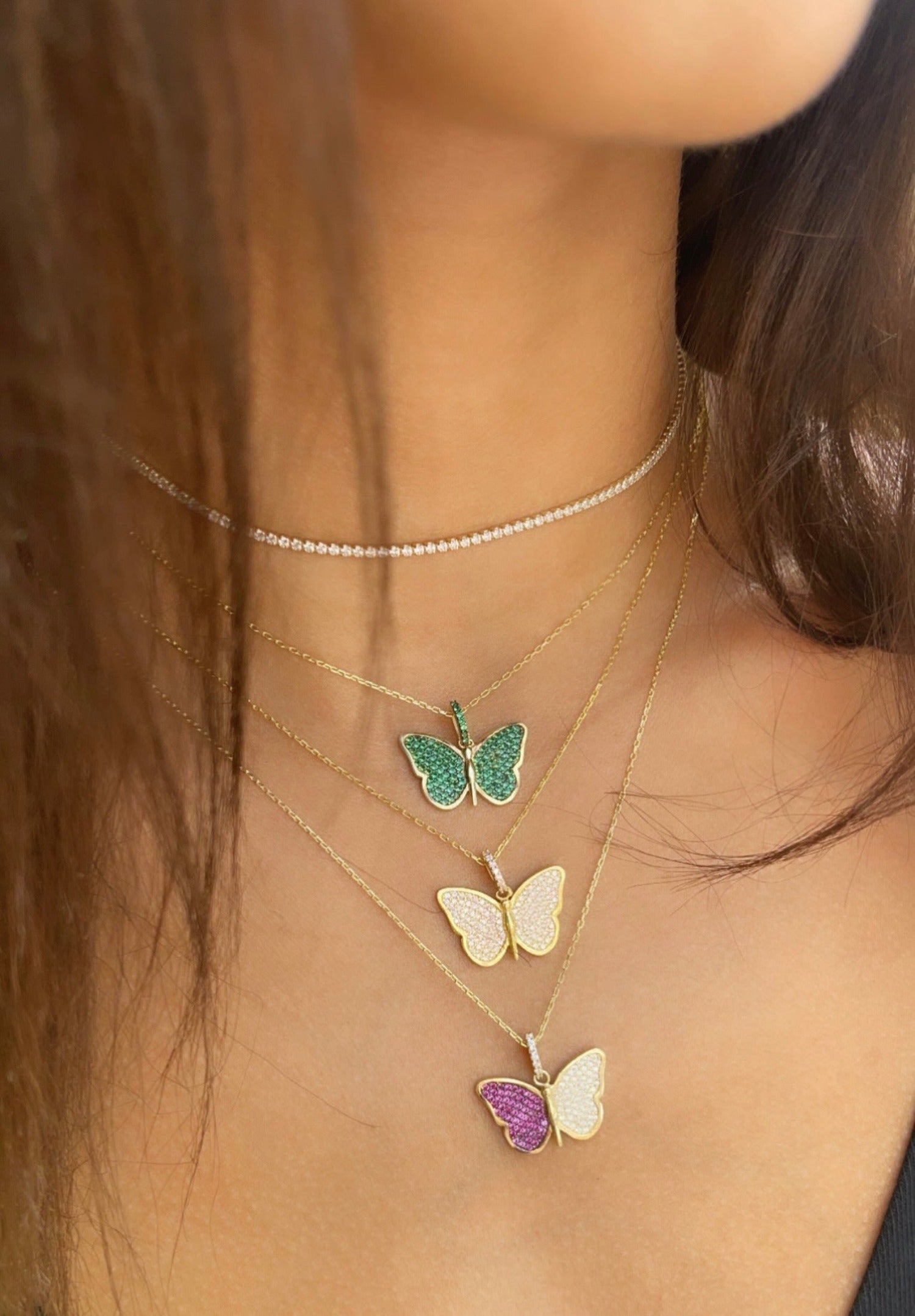 Our Pave Butterfly Necklace is the perfect accessory for the modern, chic woman. Crafted with all pave stones, this delicate necklace will add a fresh look to any ensemble. Easily slides off and on the chain.