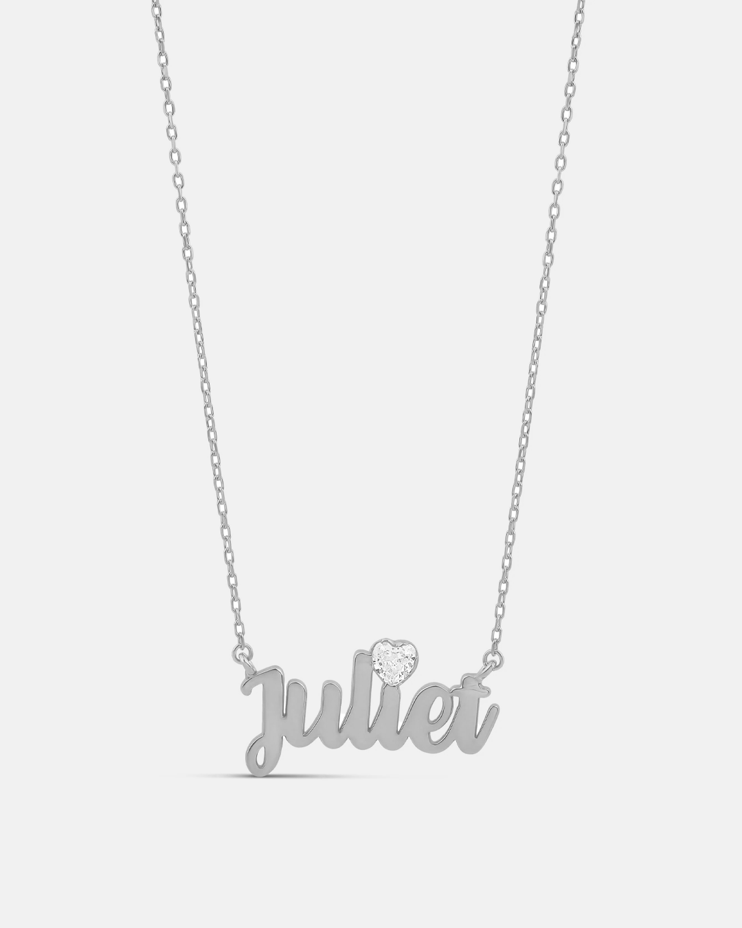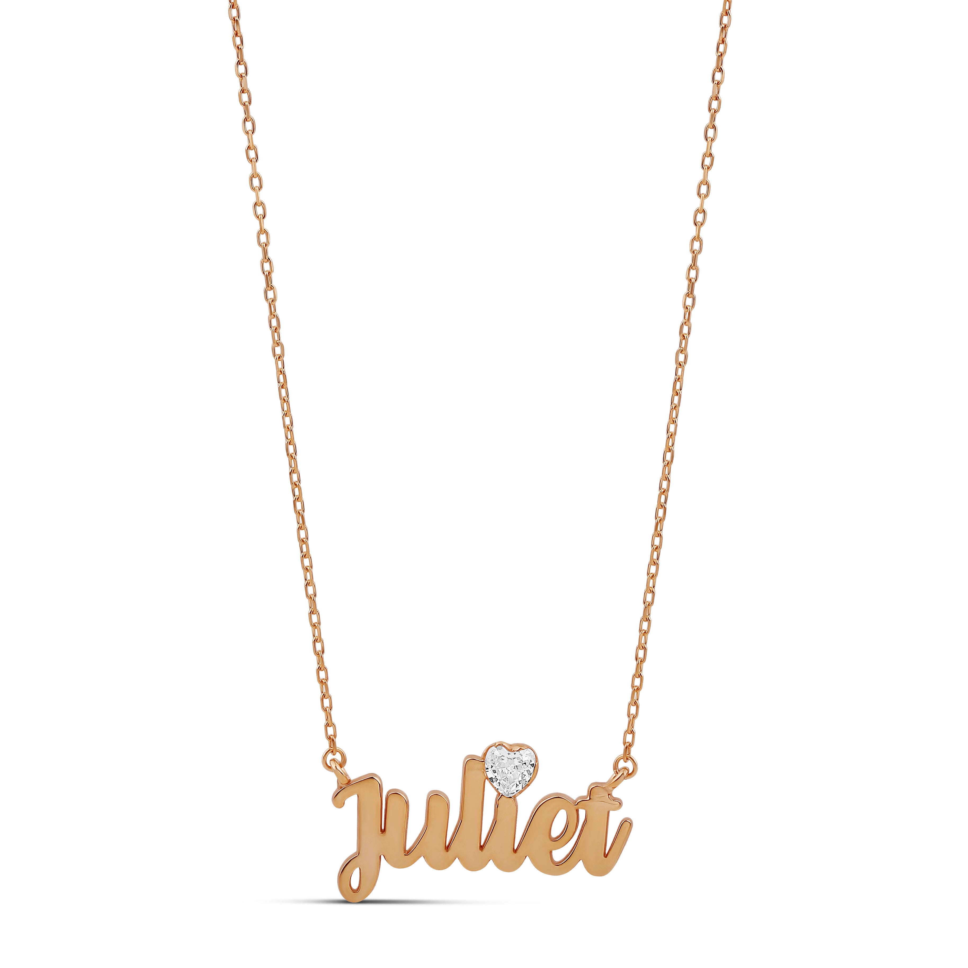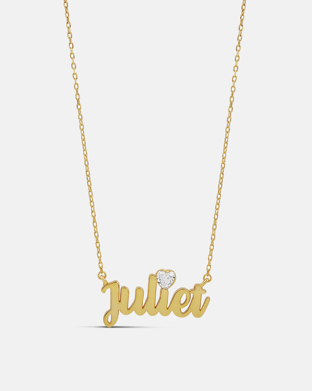 Elevate your style with this Personalized Name Necklace featuring elegant cursive letters and a charming heart-shaped cubic zirconia delicately placed in a unique spot chosen just for you by our designer. This custom piece adds a personal touch to any outfit, making it a perfect gift or a meaningful accessory to cherish every day.