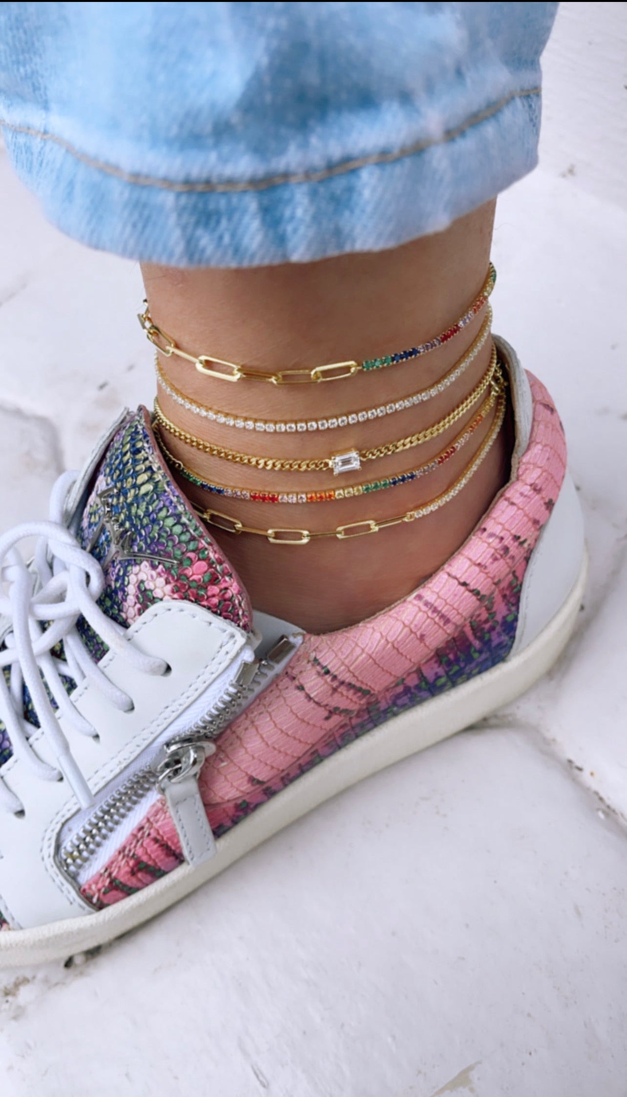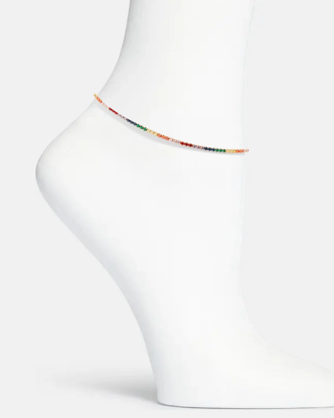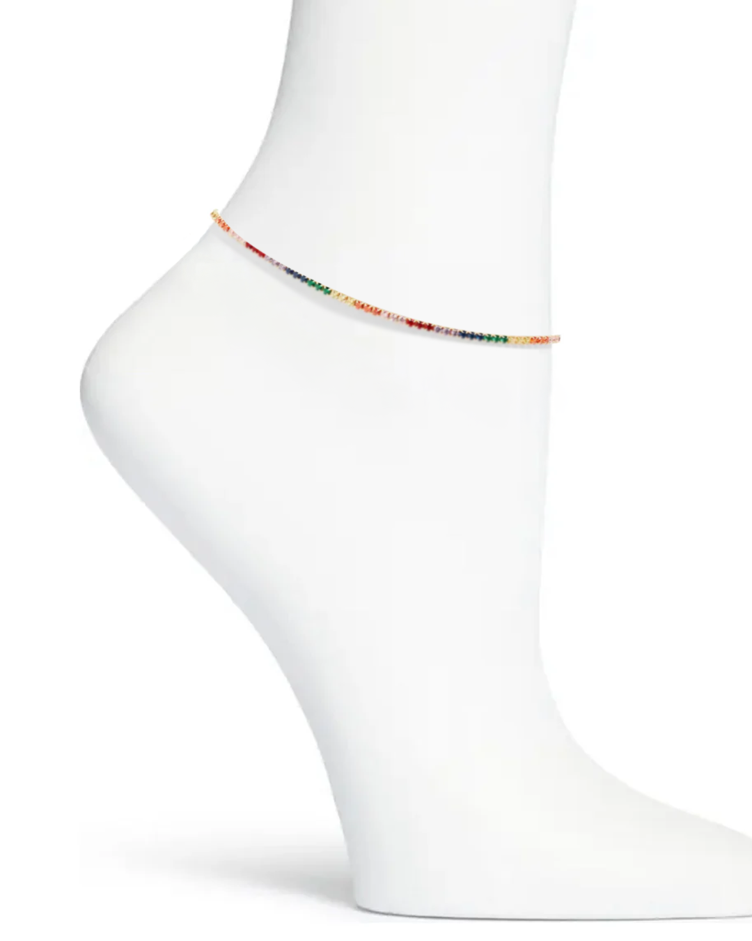 Add a splash of color to your step with this gorgeous thin tennis anklet, featuring vibrant rainbow hues in a delicate 2mm design. Perfect for brightening up any outfit, this playful anklet adds a fun, stylish touch to your summer look. Lightweight and eye-catching, it’s the perfect accessory to show off your colorful side.