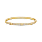 This pave studded oval shape bangle is the perfect accessory for adding a tough of glamour to any outfit. The bangle features a sparkling array of pave set cubic zirconia stones with studs in between. This bangle is 3 pave rows. Perfect for both casual and formal. Can be worn alone or added to your stack! Hinge closure makes it easy for on and off wear.