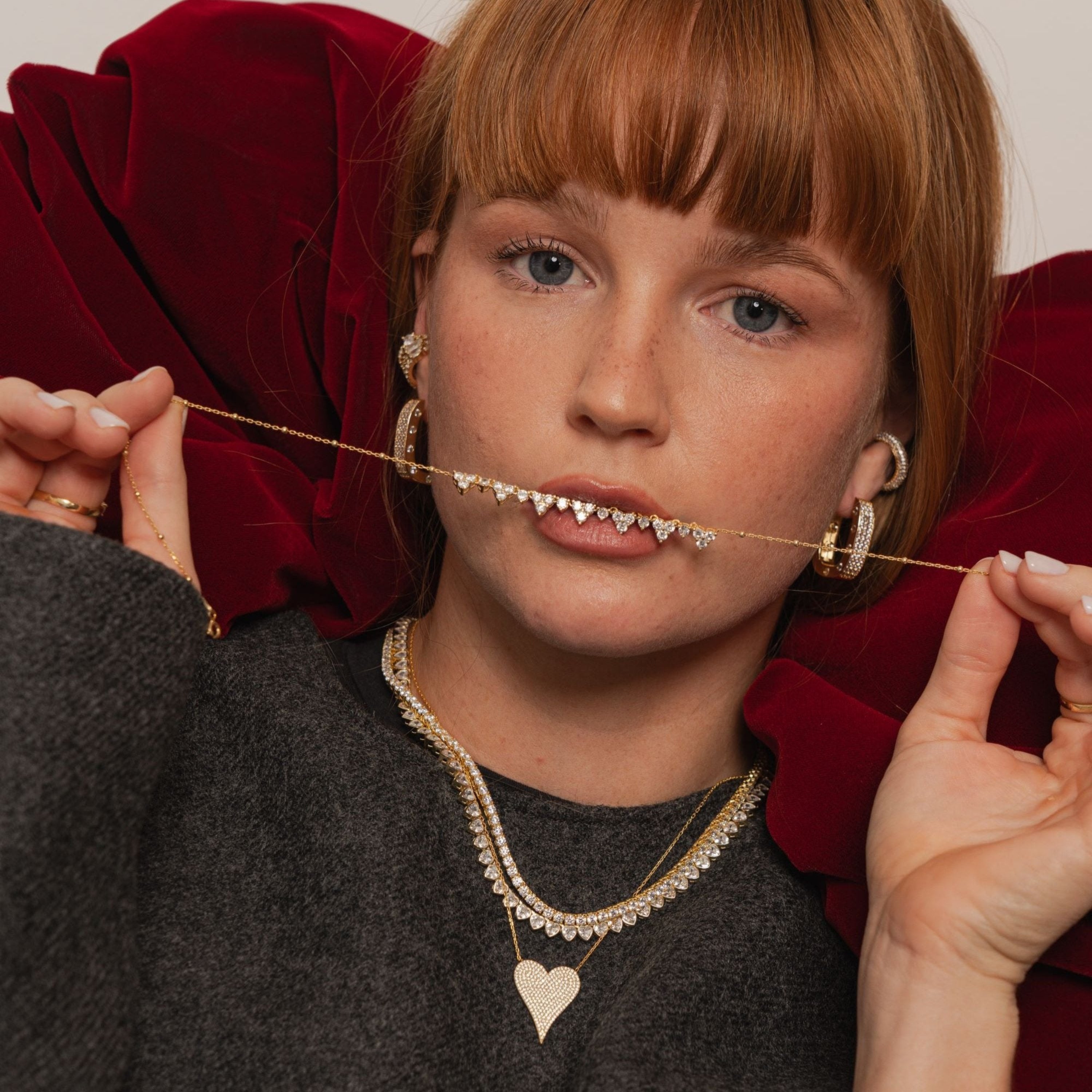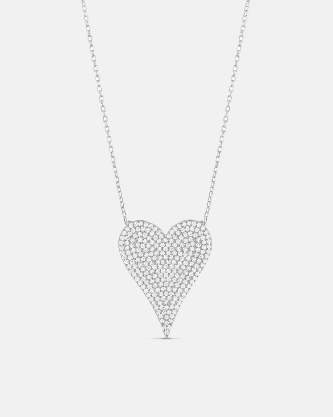 This Large Pave Heart necklace is an elegantly-crafted piece of jewelry with a classic look. The best-selling heart design is encrusted with pave stones creating a magnificent sparkle. Its elongated shape and thin glistening chain makes it perfect for any occasion. Make a statement on it's own or worn layered. Give this timeless gift to someone special or yourself. This is the large size from the collection.