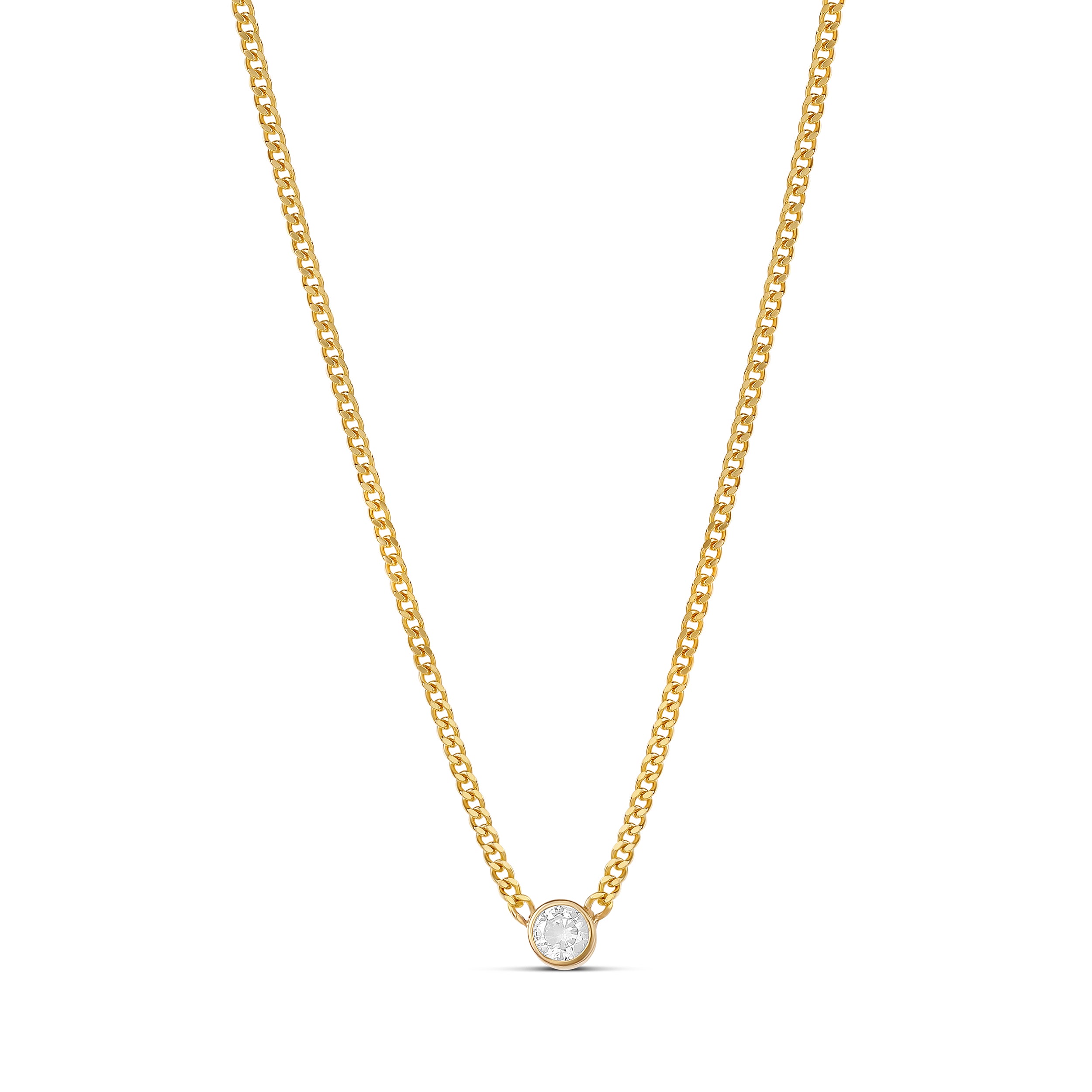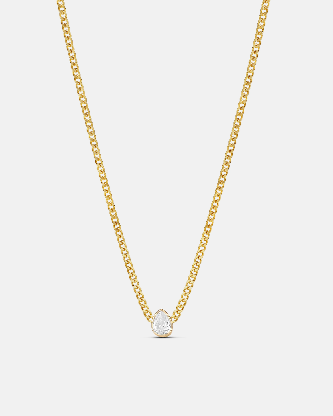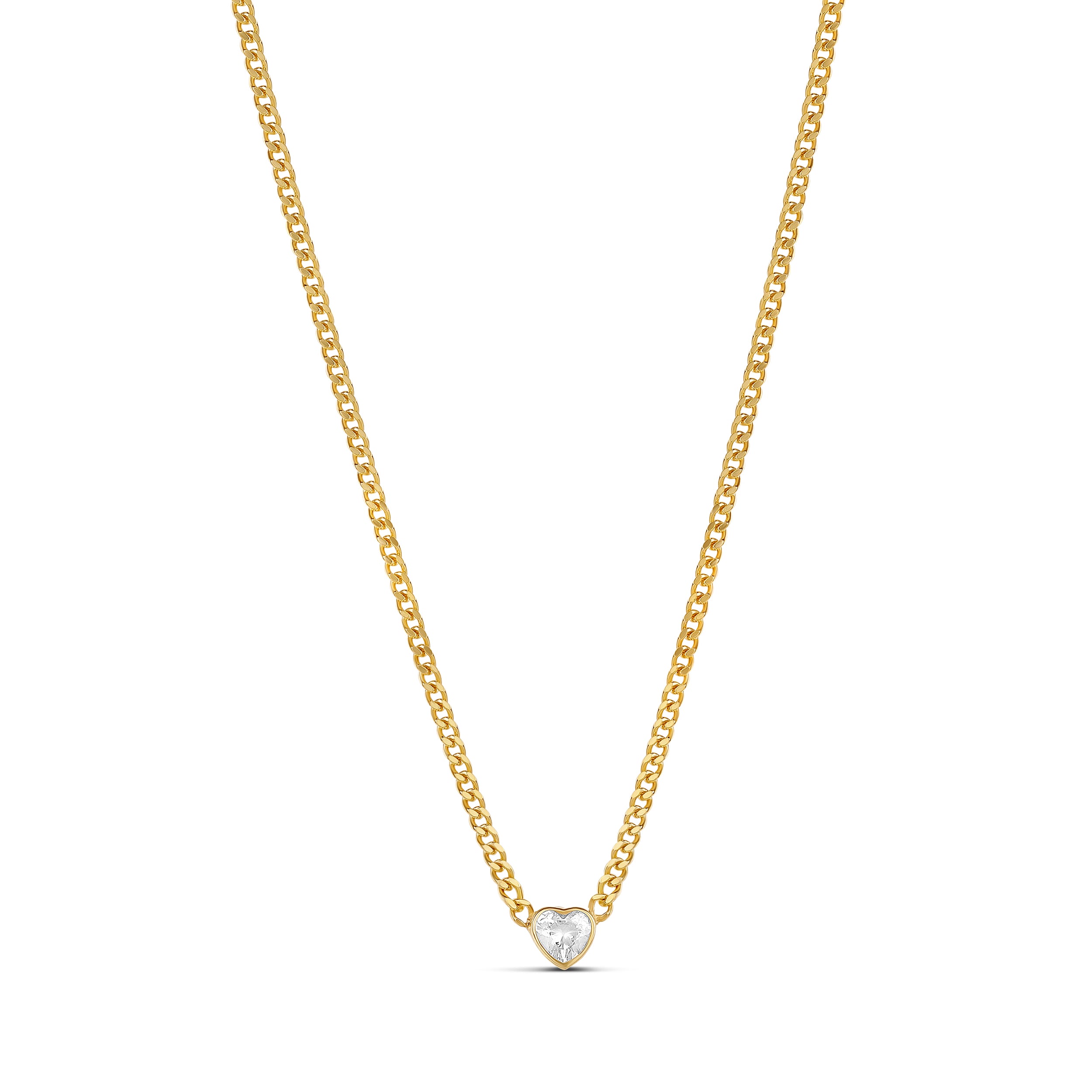 Look sophisticated and stylish wearing the Fancy Shape on a Curb Chain. Available in 4 shapes (heart, pear, emerald and round) for added versatility, each stone is set on a curb chain for a minimalist design. Great for creating a contrast of materials and stones. Looks simply beautiful on its own or warn with other layers.