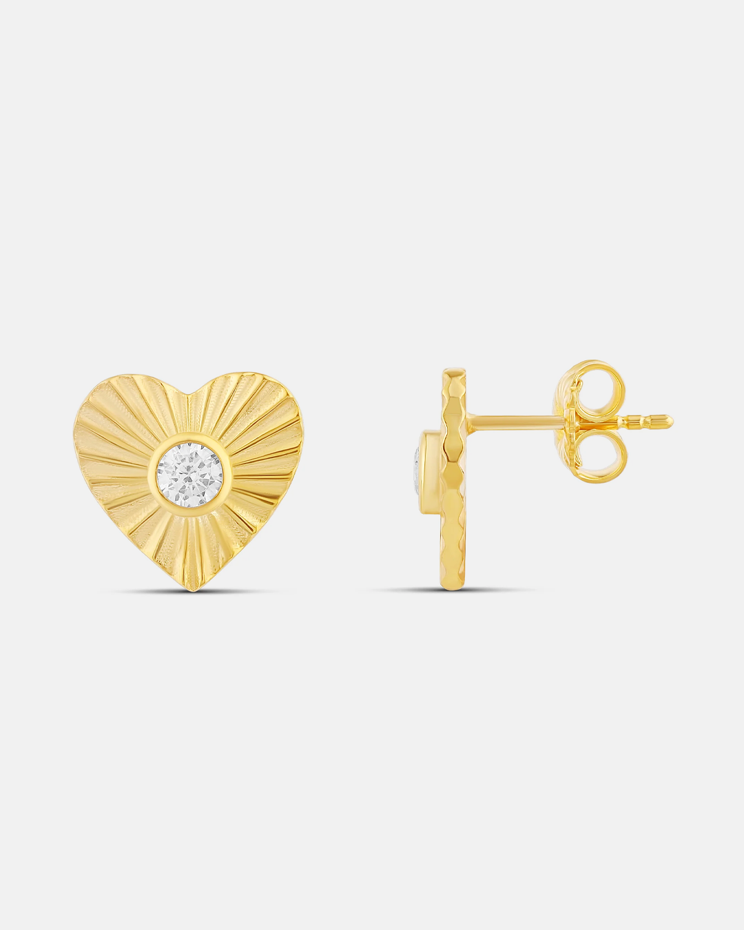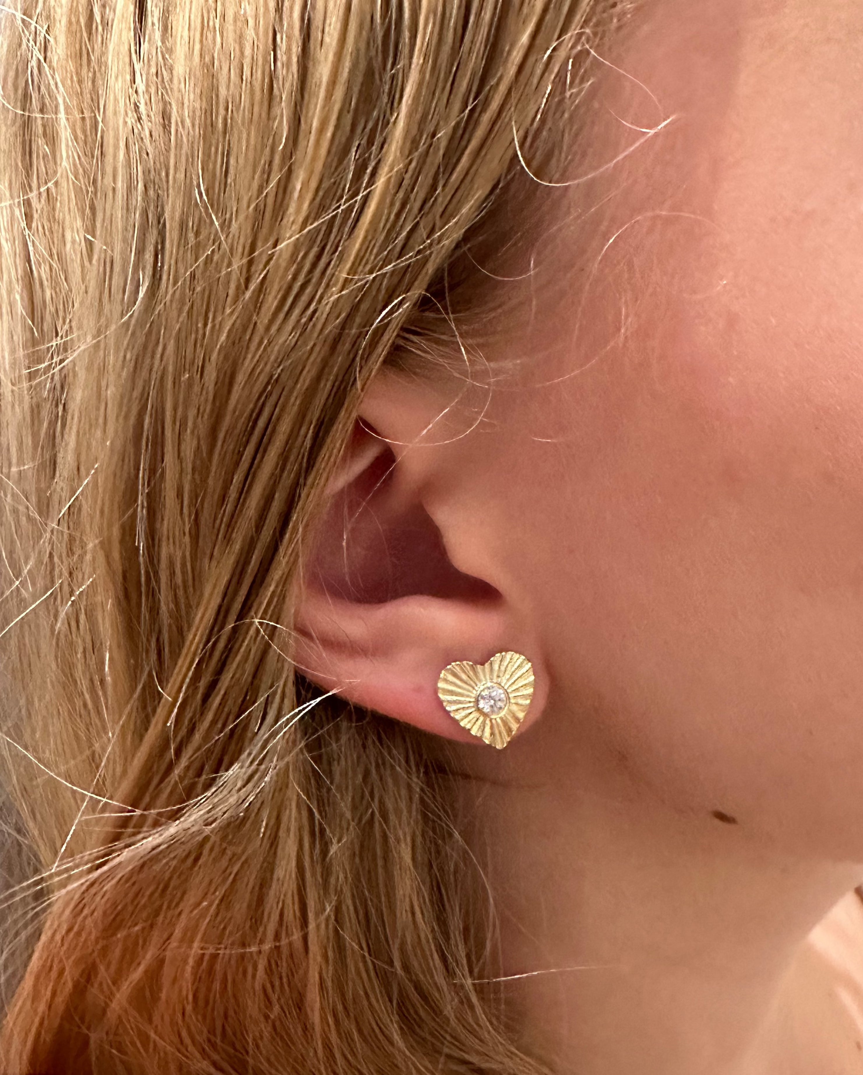 Introducing our Fluted Heart Studs, perfect for adding a touch of glamour to any look. These studs feature a gorgeous fluted heart design with a stone at the center. Can be worn as everyday wear or dressed up for a night look.