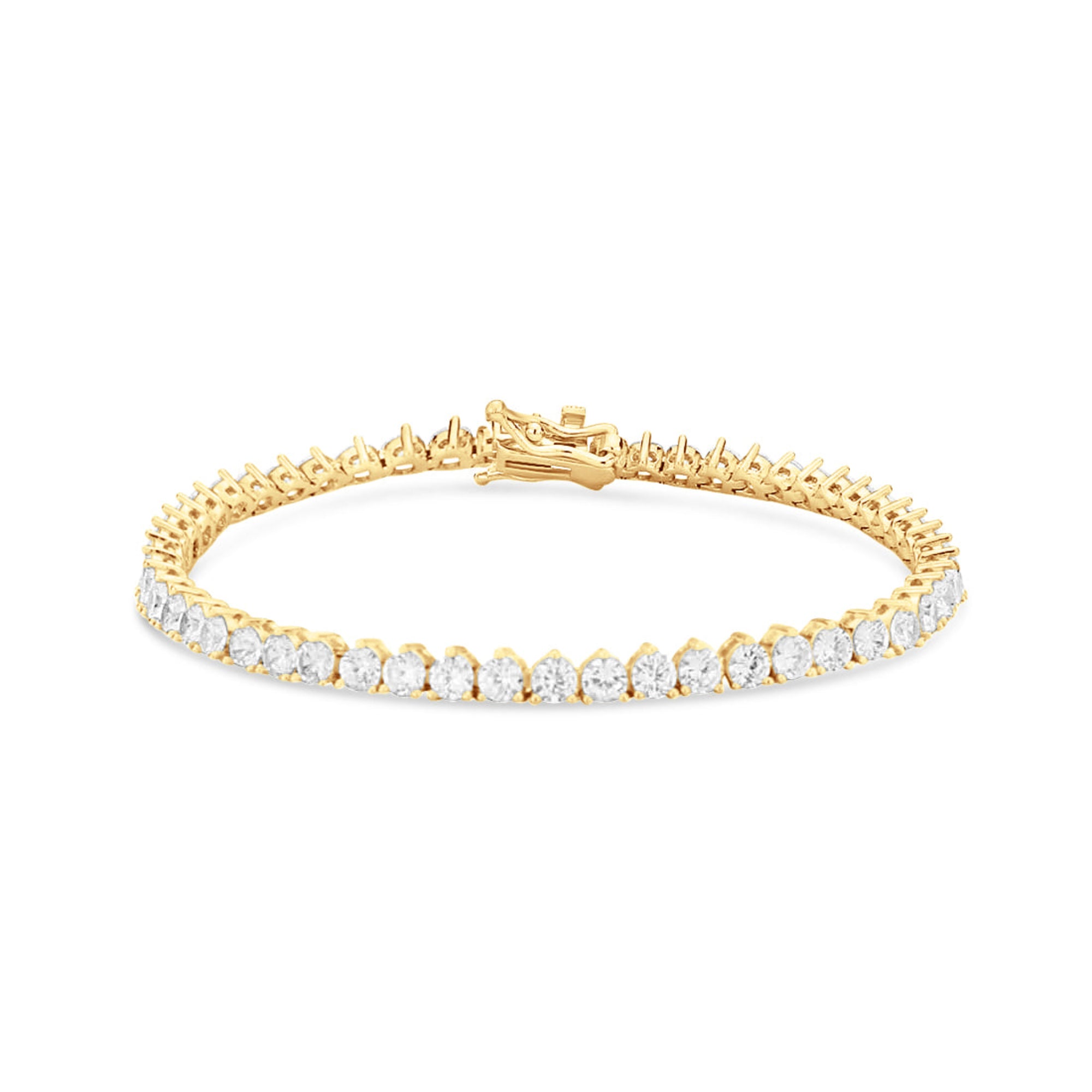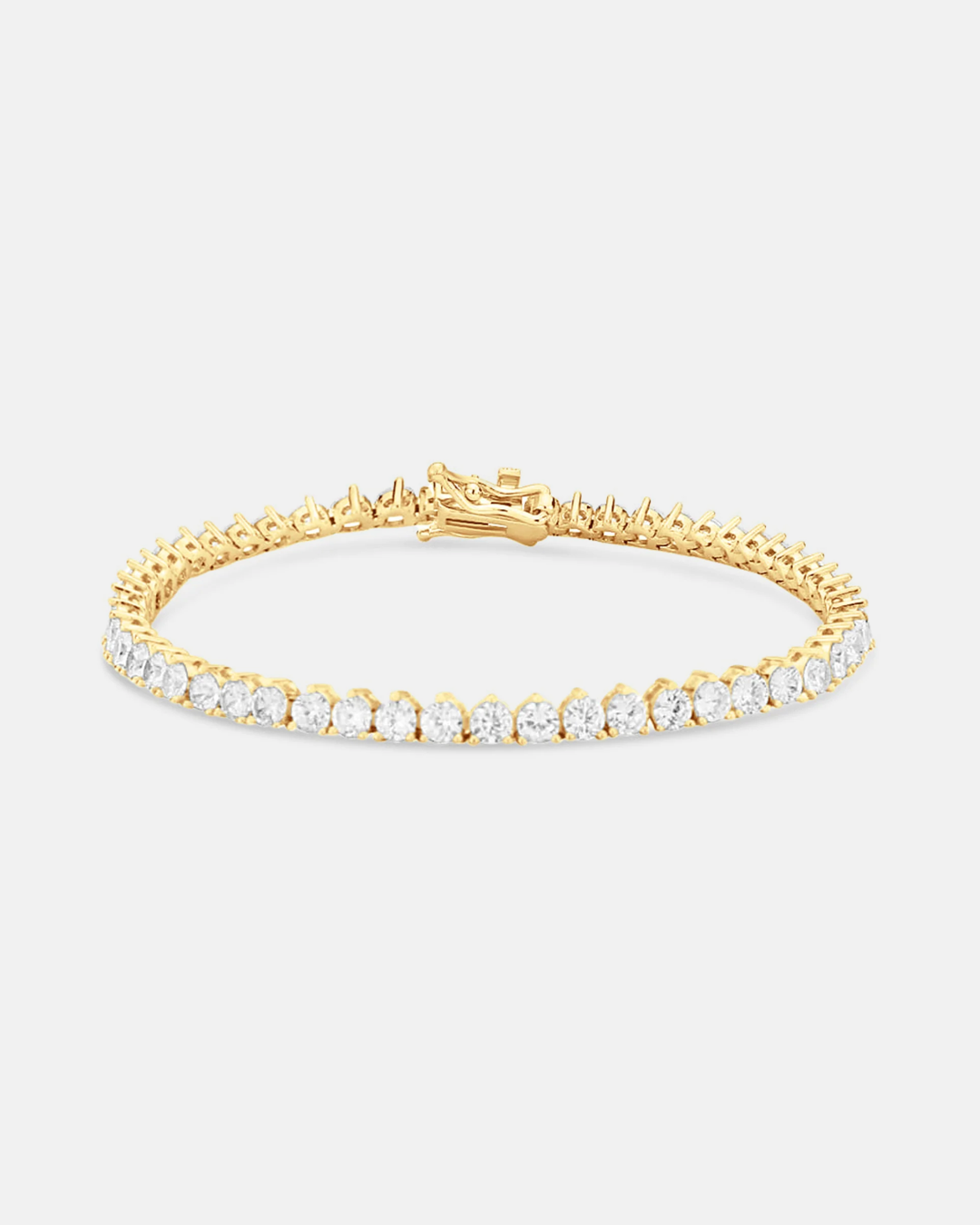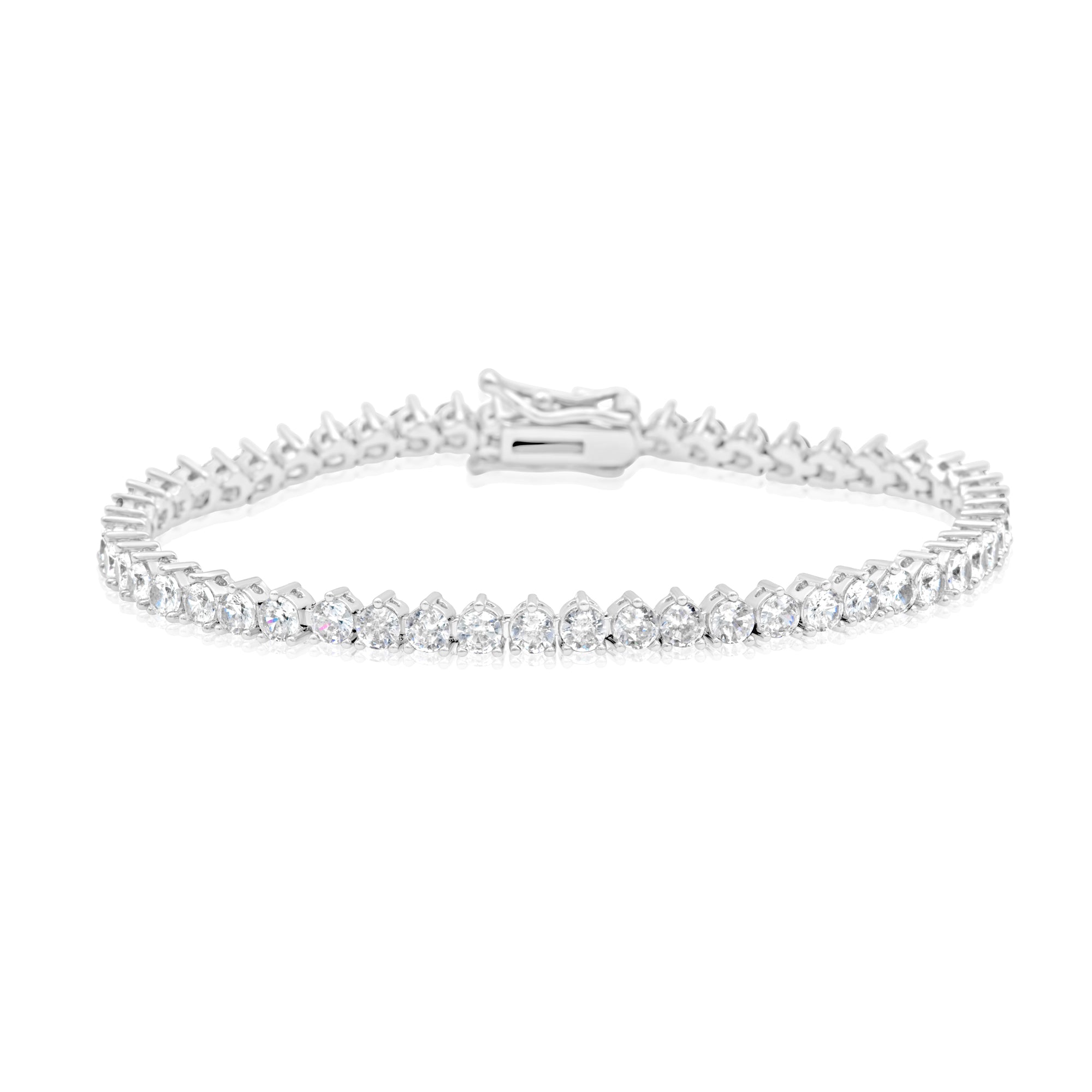 This traditional three prong 2mm round tennis bracelet comprises an essential part of any jewelry collection. Its sophisticated, timeless style exhibits sparkling cubic zirconia stones in a refined 3-prong setting. Suitable for any special event, or for everyday wear. This bracelet makes a stylish addition to any stack.