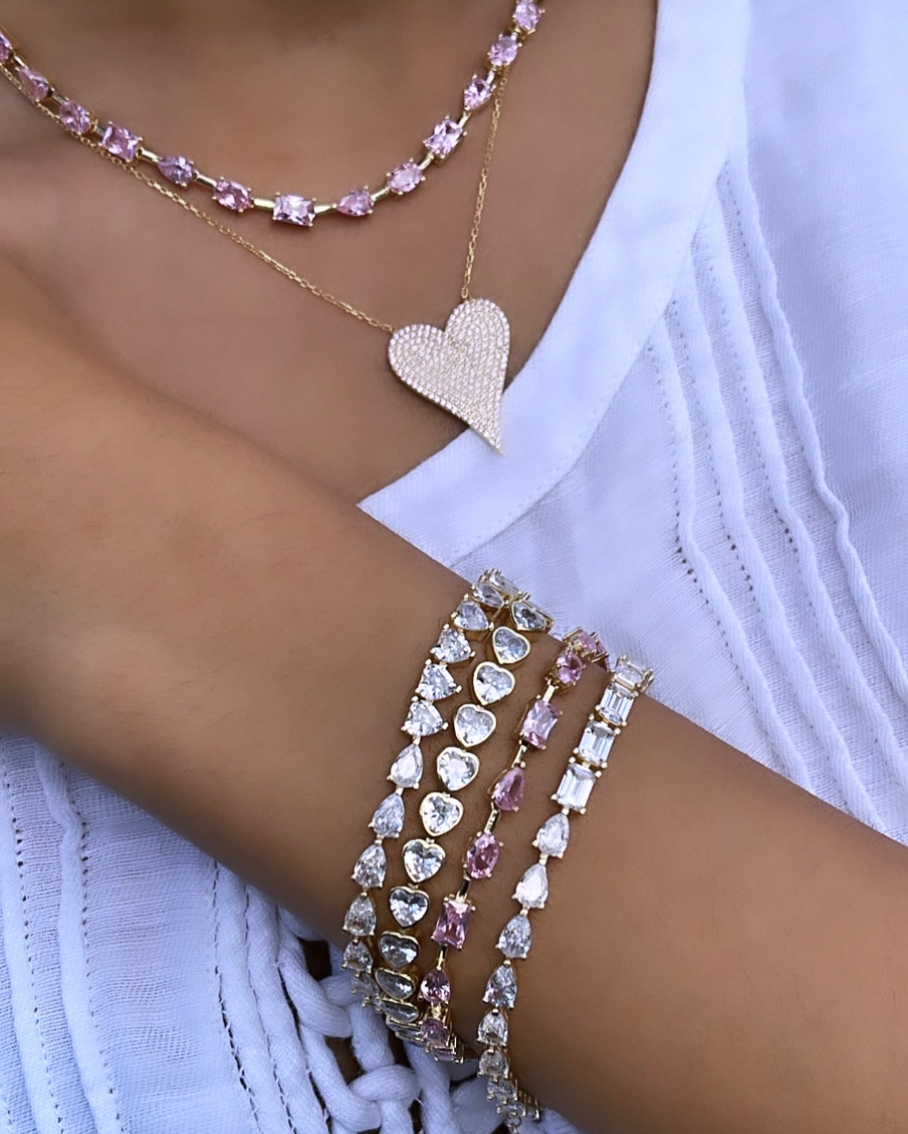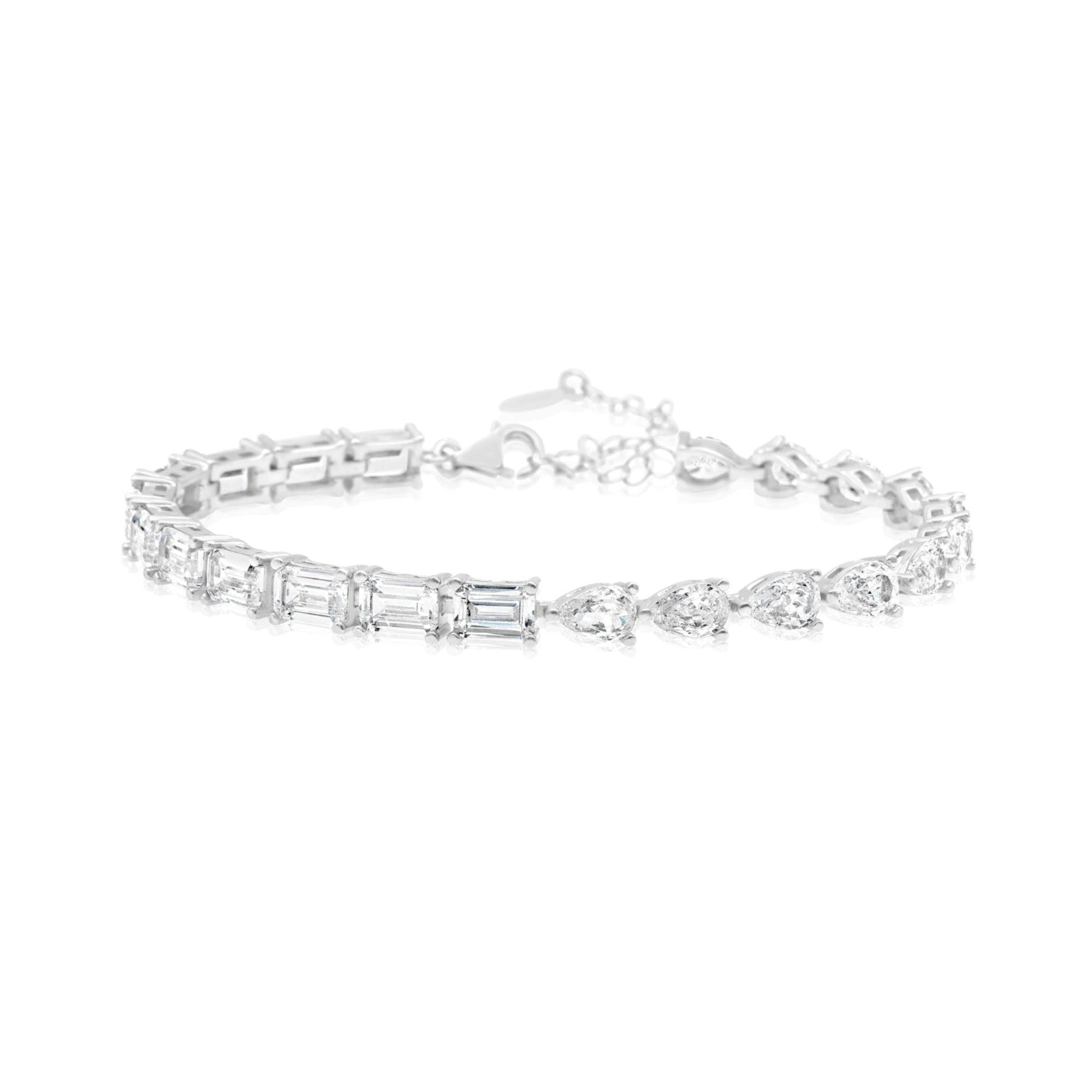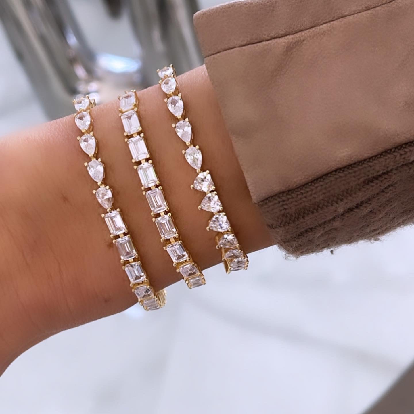 Expertly crafted with a mix of emerald and pear cut stones, this modern tennis bracelet is a must-have accessory for any occasion. Versatile and stylish, it can be worn alone or stacked with other bracelets for a glamorous touch. Elevate your look with this stunning piece.