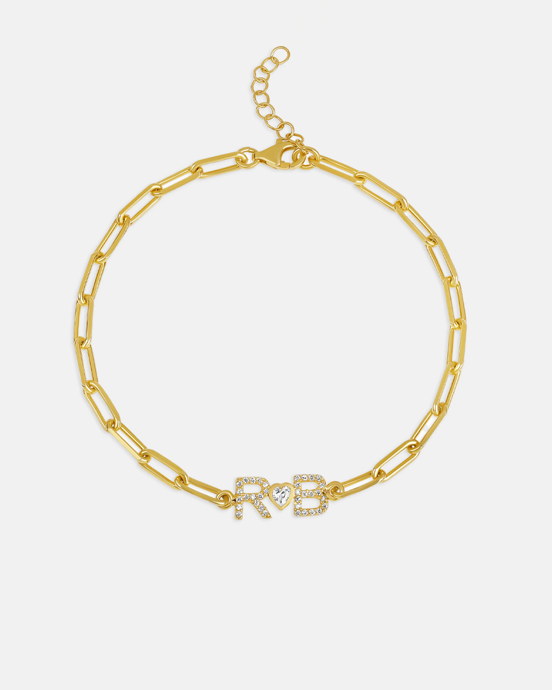 Celebrate your unique bond with this personalized bracelet featuring two pave-set initials separated by a sparkling heart. The elegant paper clip chain adds a modern touch, making it a versatile piece for everyday wear or special occasions. Crafted to reflect your personal story, this bracelet is the perfect meaningful gift or a stylish addition to your own collection.