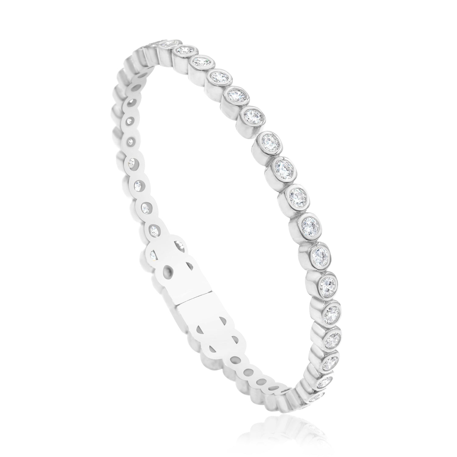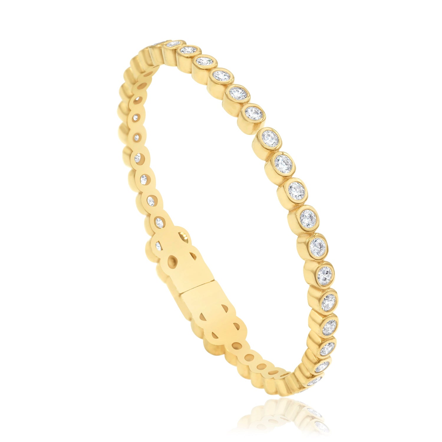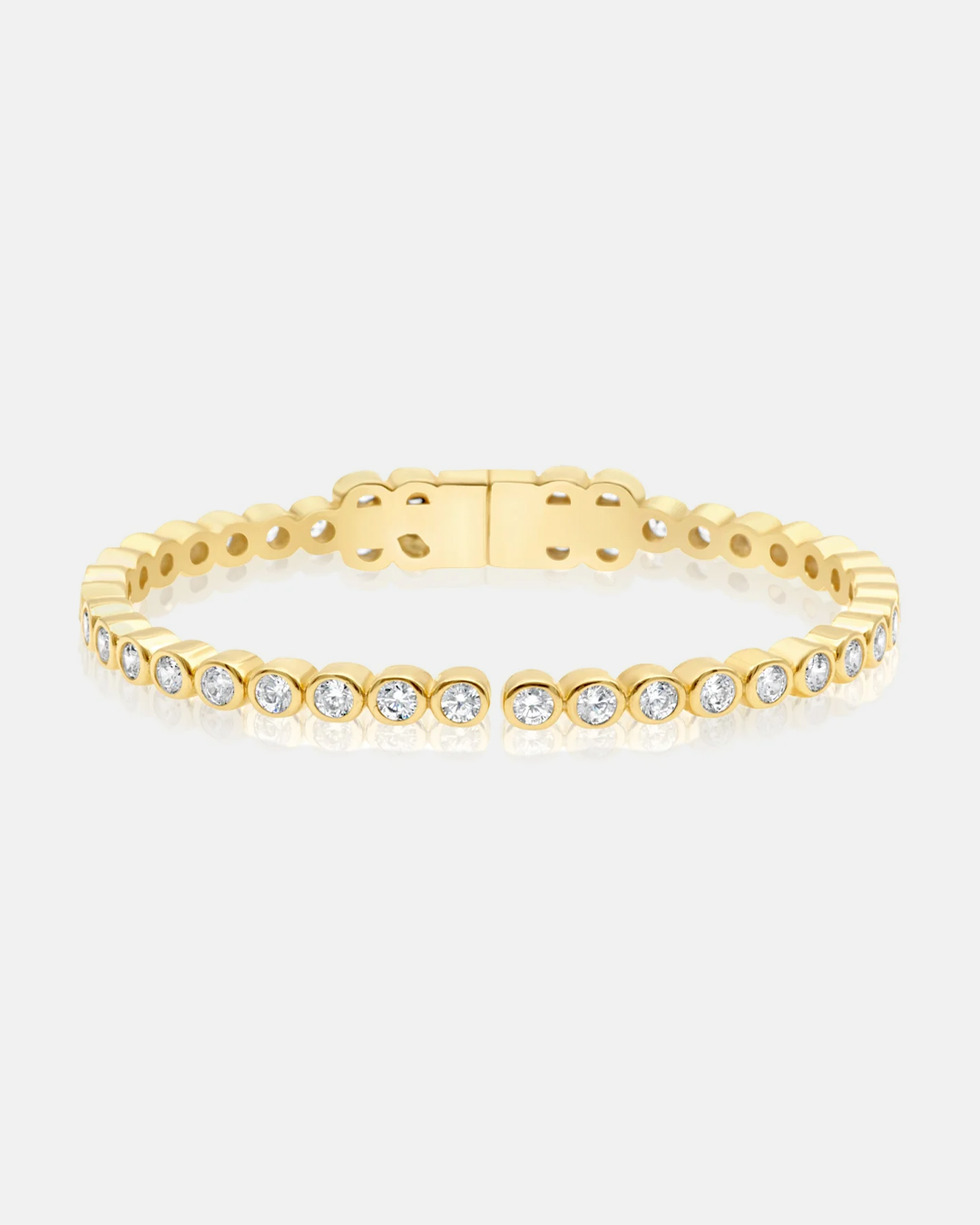 Introducing the Round Bezel Open Bangle, a gorgeous everyday accessory that is a must-have in any jewelry box. Its effortless design allows for easy on and off, making it the perfect addition to any bangle stack. Elevate your style with this versatile and timeless piece.