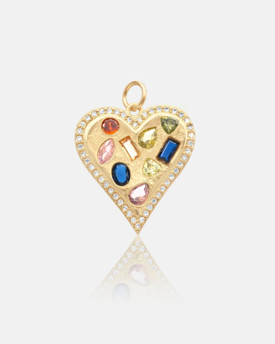 This multi shape, multi color heart charm is perfect for adding a touch of sparkle to any look. The elongated shape of the heart is encrusted with pave stones, creating a luxurious piece that is sure to turn heads. A timeless accessory that never goes out of style. For a bolder look, pair it with our Charm Connector to wear on a thicker chain and add multiple charms. Charm Connector sold separately.