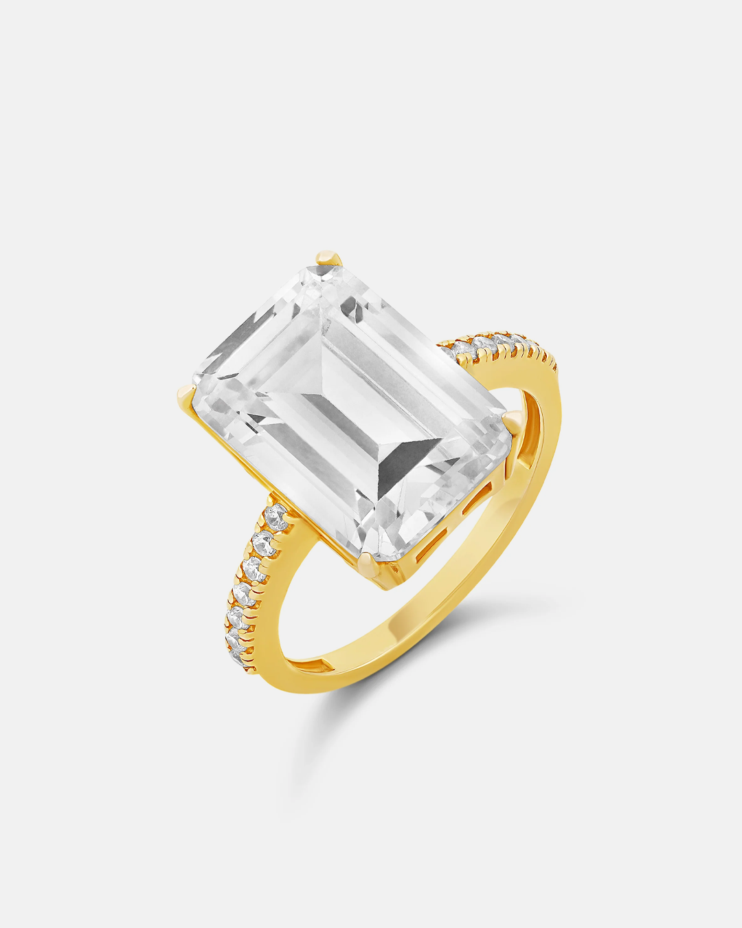Elevate your style with our Emerald Cut Statement Ring. This large cocktail ring features a stunning emerald-shaped stone, accented by a pave band. Perfect for both evening wear and adding a touch of glamour to your everyday look. A must-have for any fashion-forward individual.