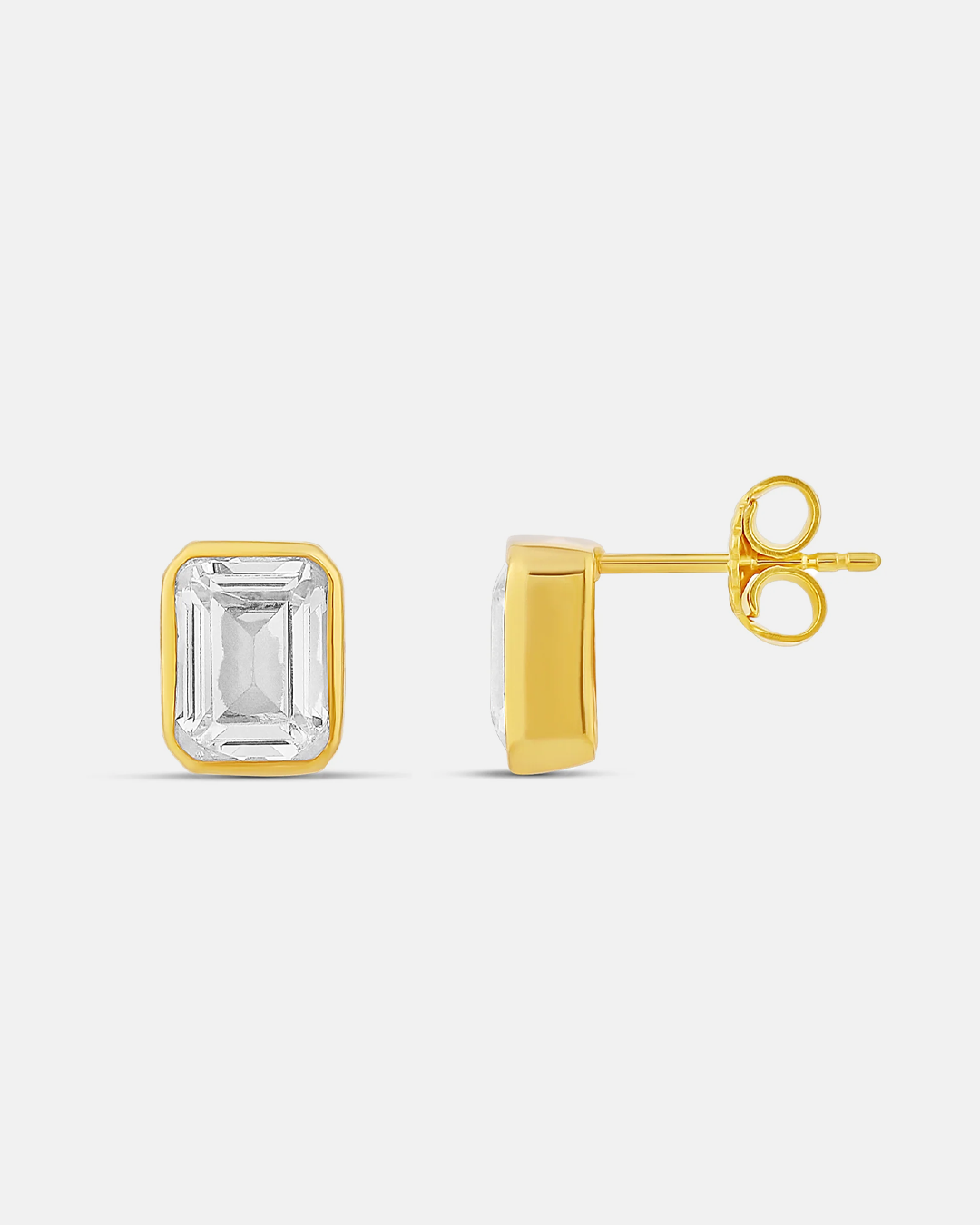 Beautiful fancy shape studs set in an eye-catching bezel design, these earrings add a sophisticated touch to any outfit. Choose between an emerald, heart, round or pear shape stone, they are perfect for elevating any look from day to night. These studs are more than just a basic accessory, and will keep you on trend.