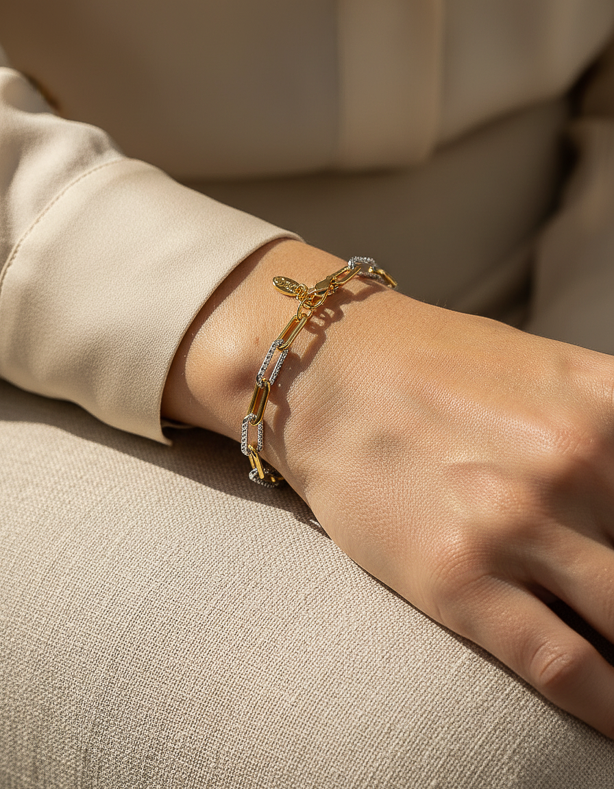 Expertly crafted with a minimalist design, this 5mm two tone gold and silver paper clip bracelet effortlessly adds a touch of elegance to any outfit. Its versatile style makes it the perfect accessory for any occasion.