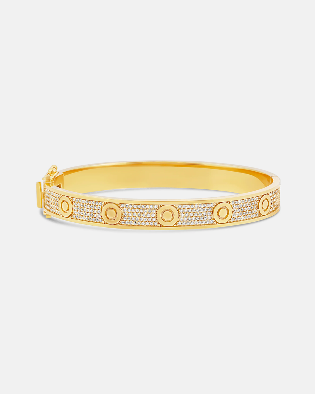 The Pave Circle Stud Bangle features a heavy, modern design accented by refined circle studs, creating a stylish and sophisticated statement piece. Its bold structure paired with sleek detailing offers a perfect balance of contemporary elegance and timeless appeal, ideal for elevating any look with understated luxury.