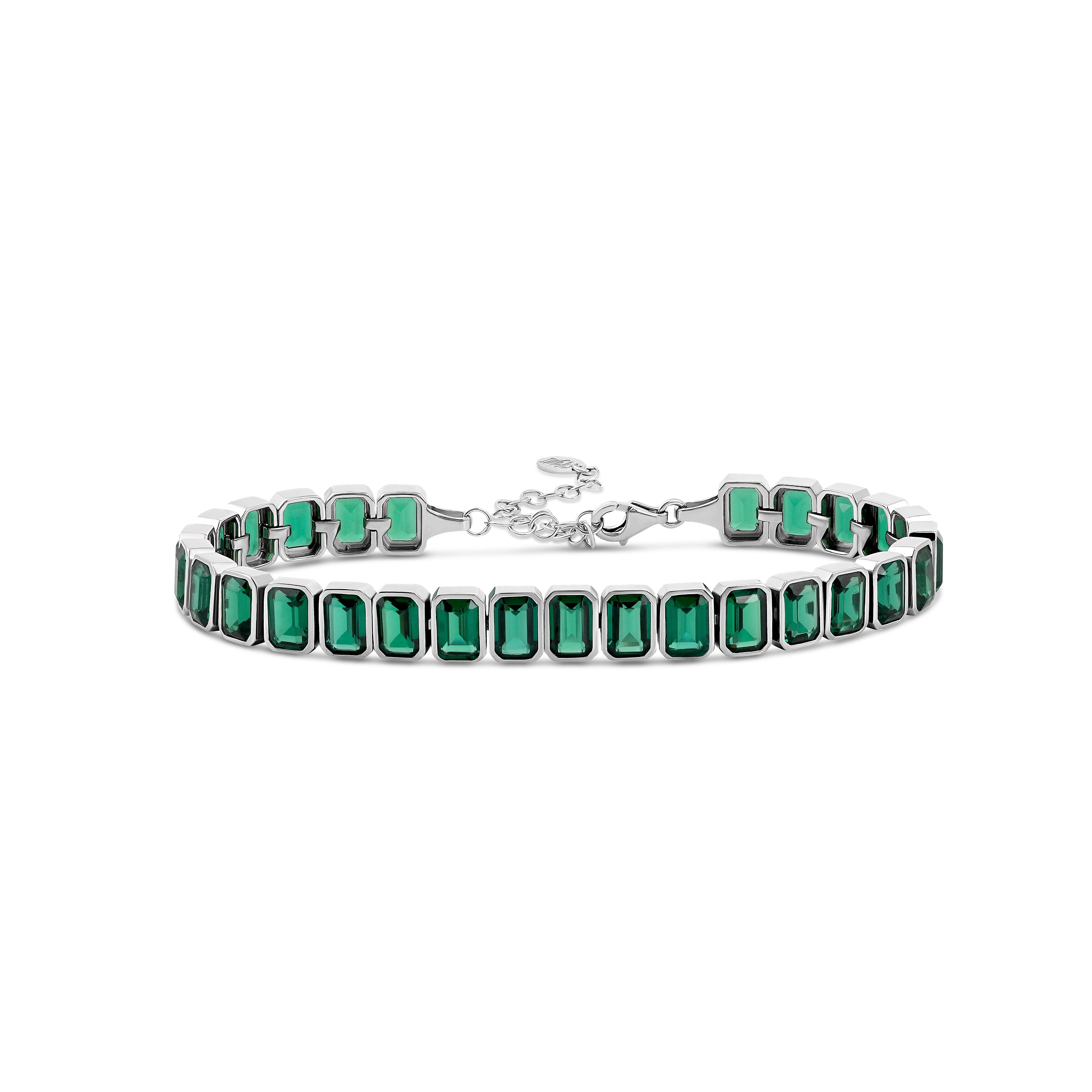 This Bezel-Set Emerald Tennis Bracelet is designed for those who demand sophistication and elegance. Crafted in a show-stopping large bezel set Emeralds, this bracelet has a gorgeous iridescence. A great piece to wear alone for a statement look, or to add a pop of colorful elegance to any stack. Available in pink / gold or green / silver