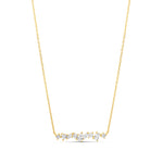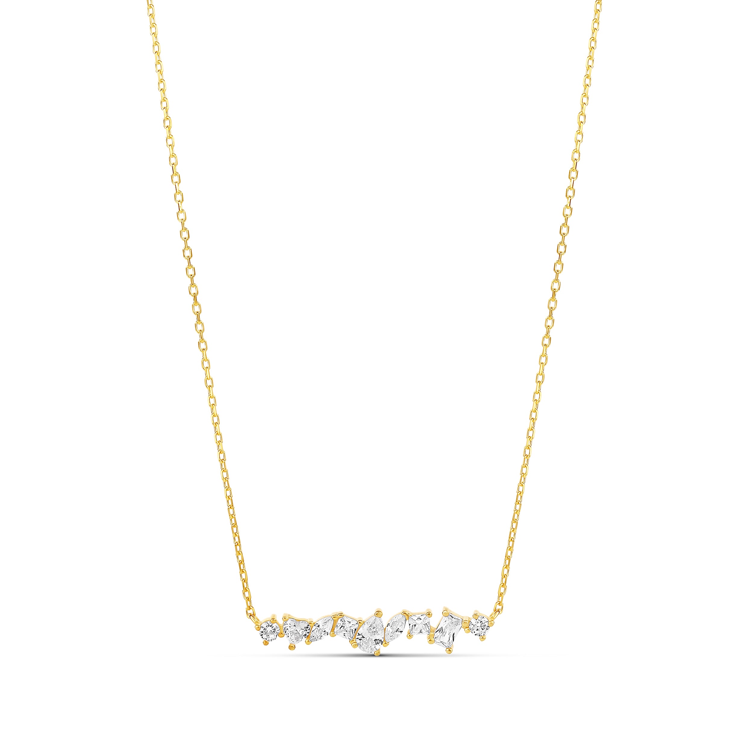 A modern take on classic sparkle, this bar necklace features a curated mix of multi-shaped stones set in delicate prongs along a sleek horizontal design. Each unique cut catches the light differently, creating a subtle yet eye-catching shimmer. Effortlessly elegant, it’s the perfect everyday piece to wear alone or layered with your favorite necklaces.