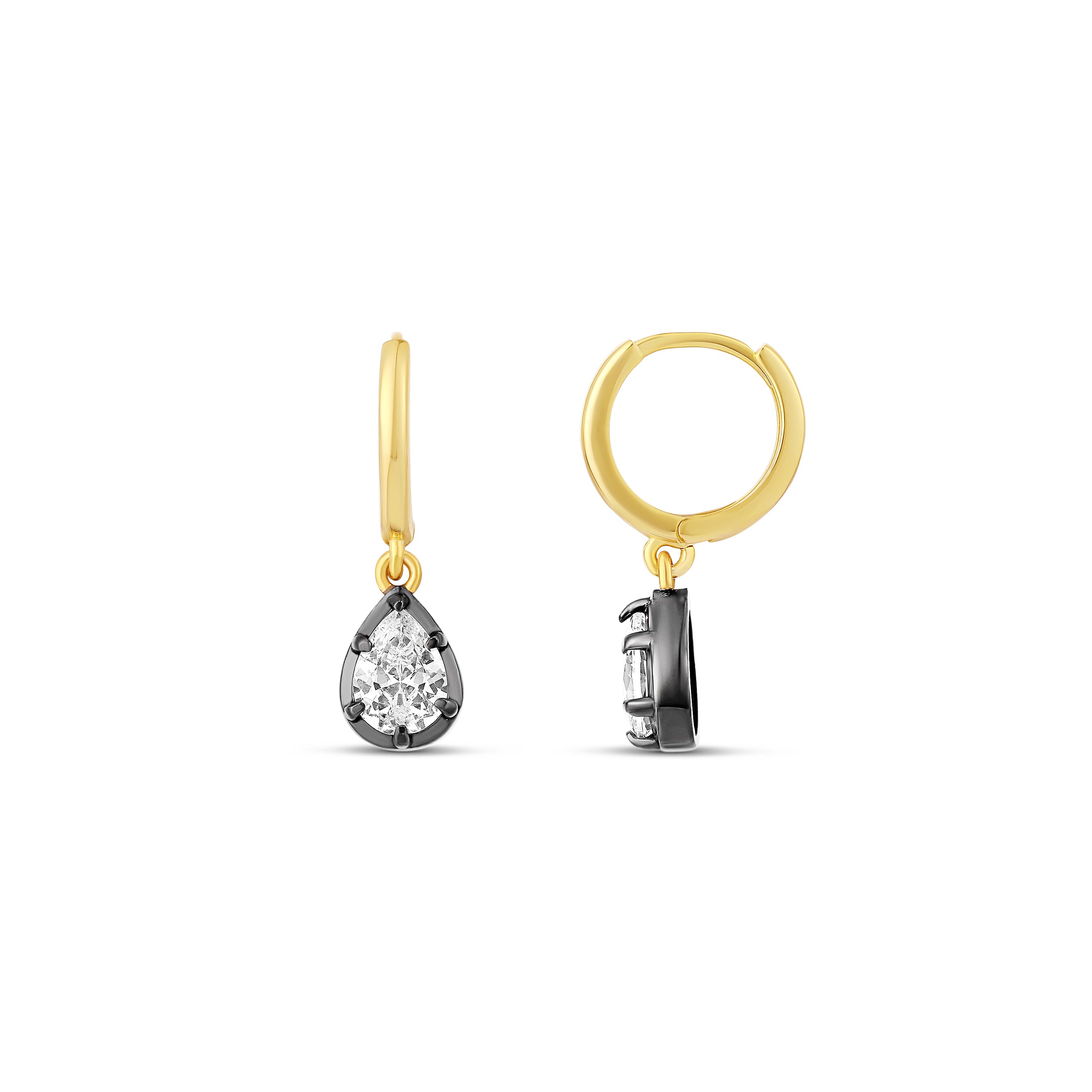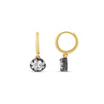 Add a modern edge to your sparkle with these Prong-Set Black Rhodium Drop Earrings. Featuring brilliant stones set in sleek black rhodium prongs, the contrast highlights each facet for a bold, eye-catching shine. Suspended from classic gold hoops, these earrings create the perfect balance of elegance and contemporary style. Lightweight and versatile, they’re an effortless statement for both everyday wear and special occasions.