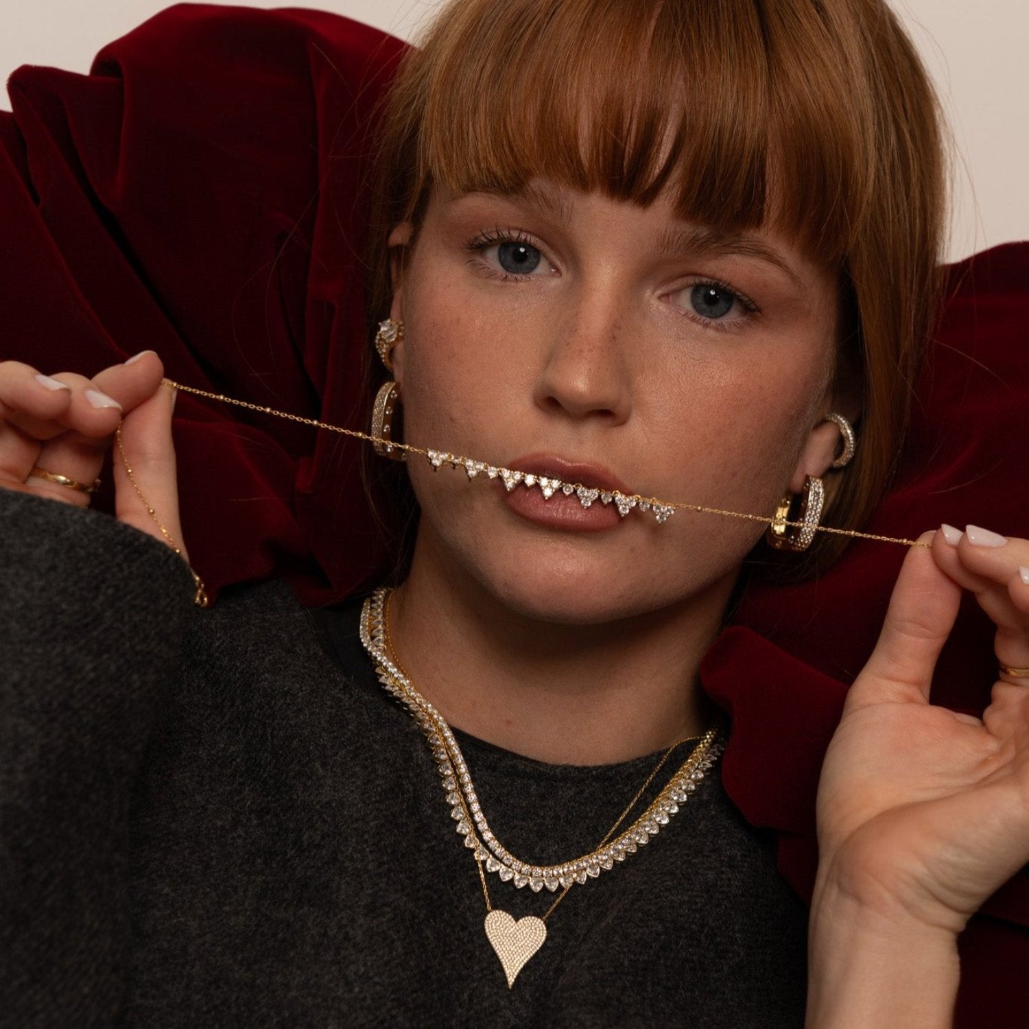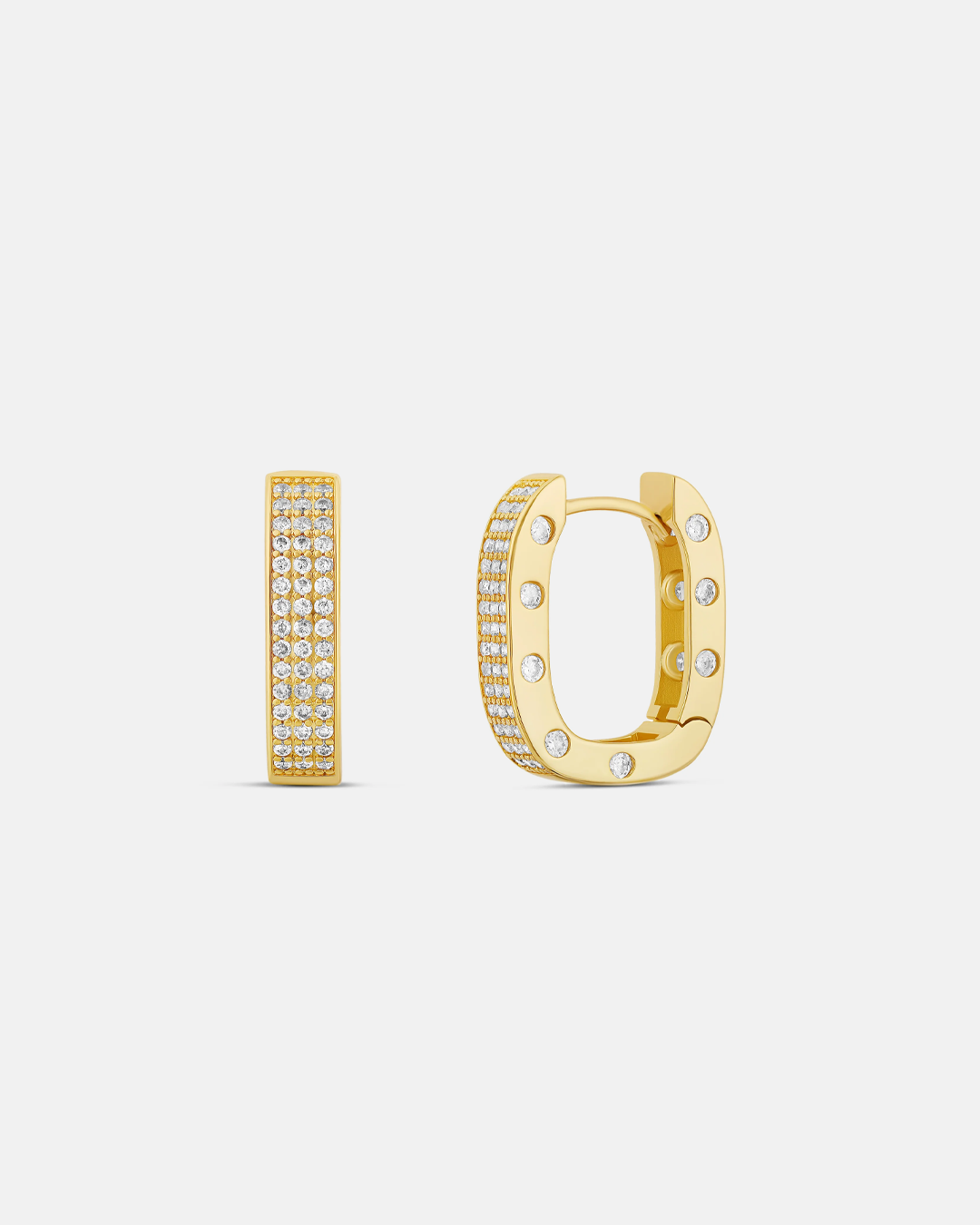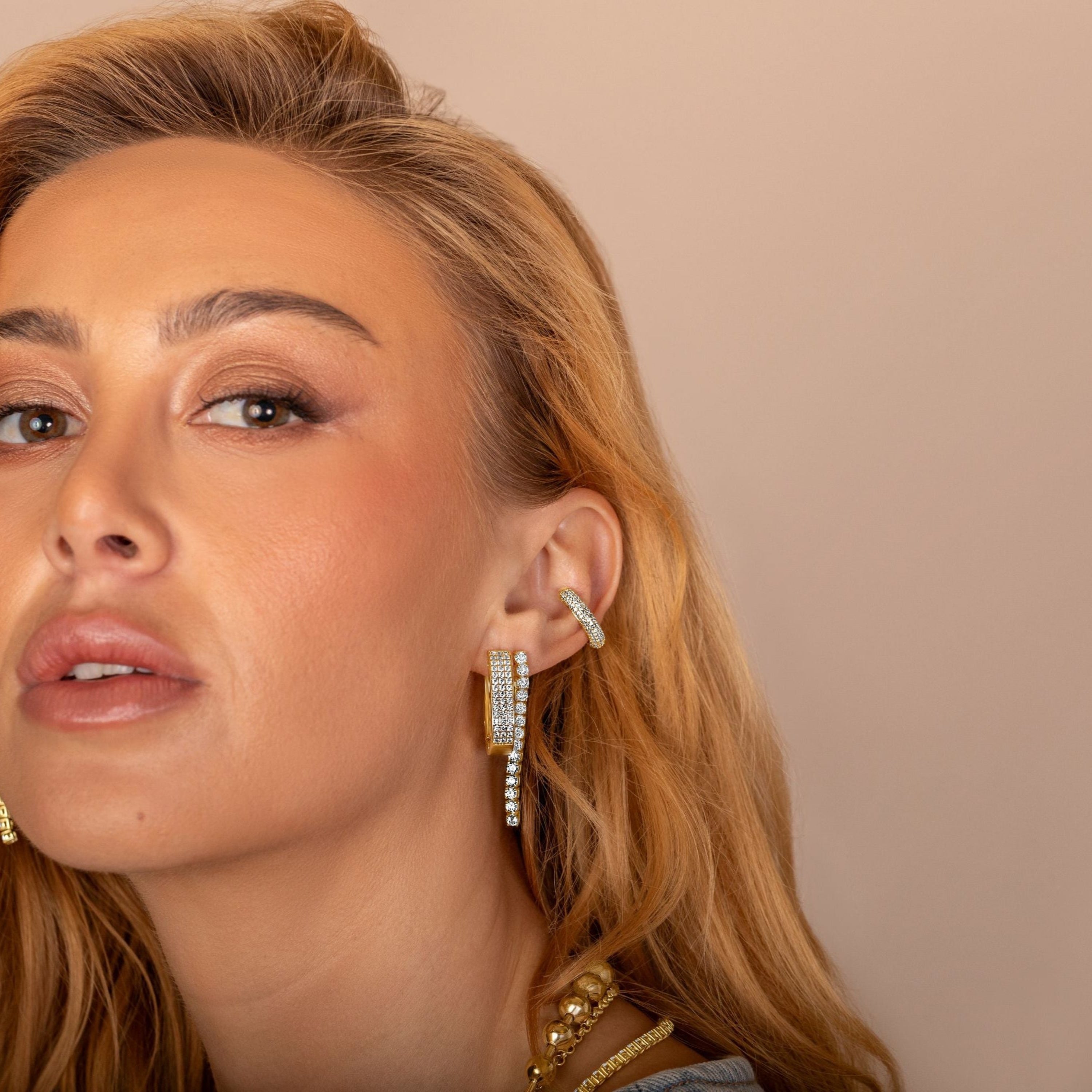 Elevate any outfit, day or night, with our gorgeous chunky pave horseshow hoops. These modern drop earrings make a statement and are on trend, adding a touch of drama to your look. Perfect for any occasion, they are the ultimate accessory for a fashionable and polished look.