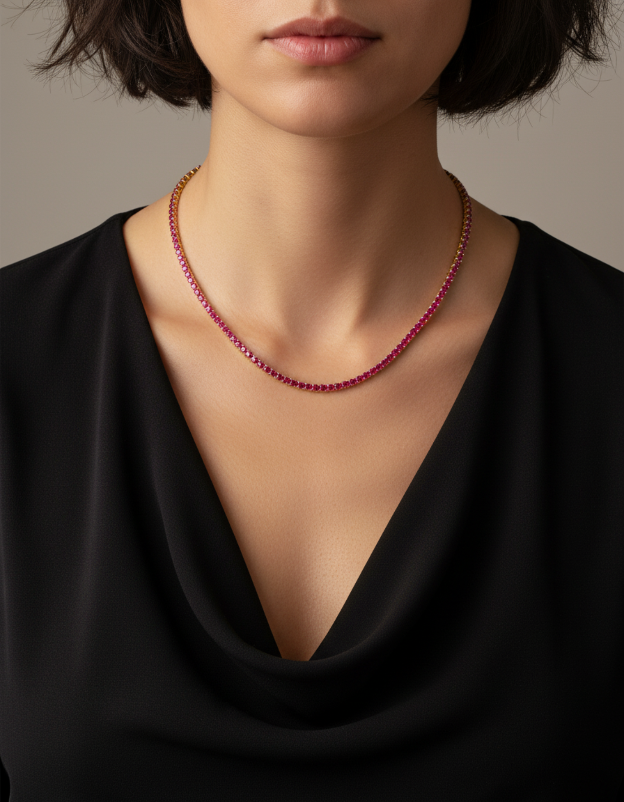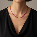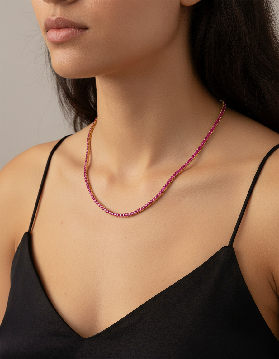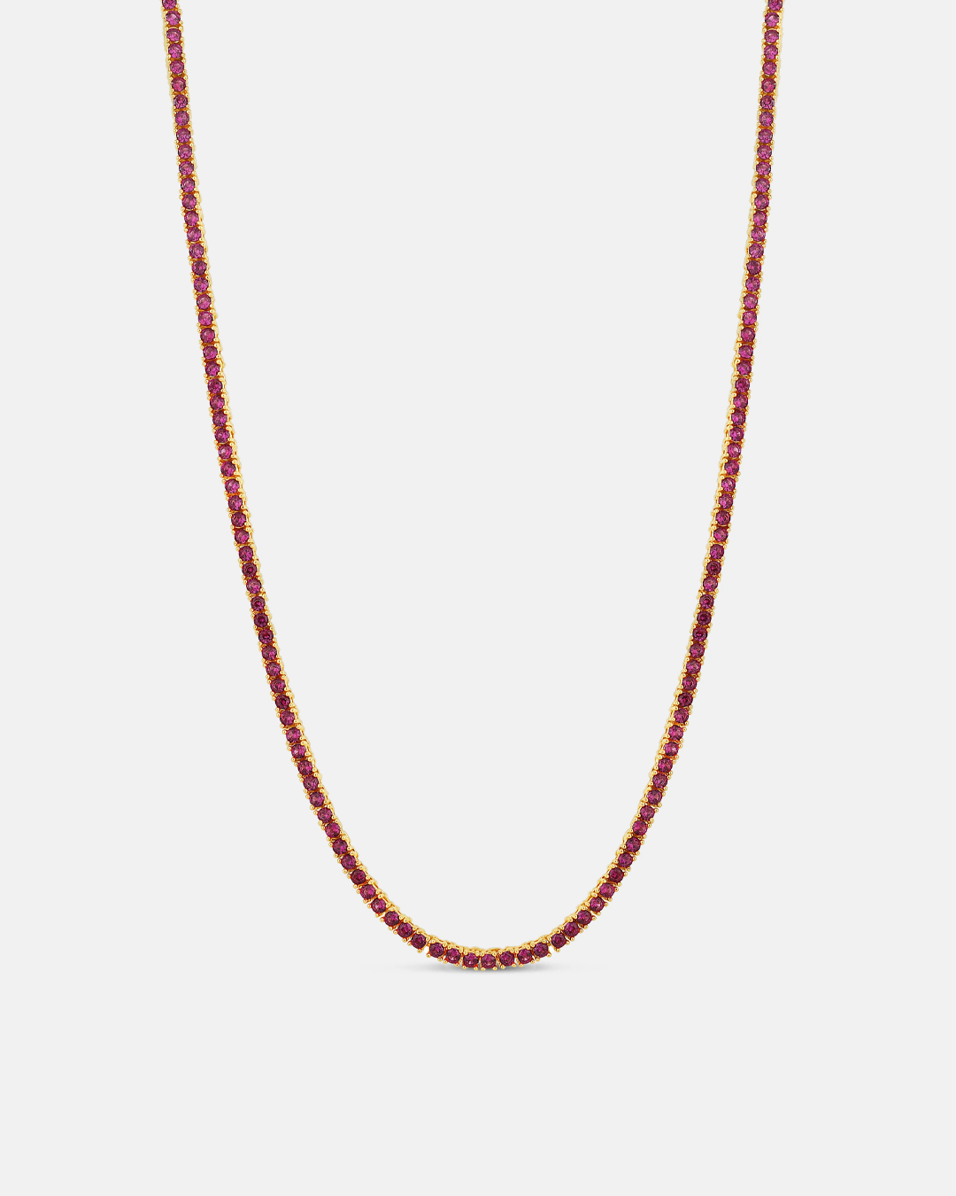 Add a pop of pink fun with this Classic Ruby 2mm Tennis Necklace. Featuring tiny 1.5mm stones, it’s a playful sparkle that effortlessly brightens your look. Lightweight and charming, this necklace is perfect for mixing into your everyday style.