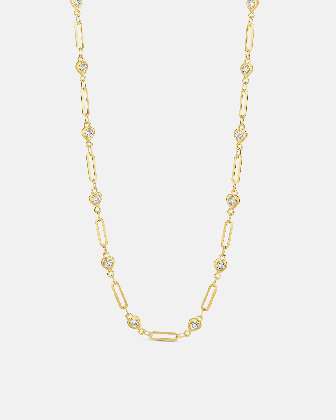 This delicate paper clip and stone short chain is perfect for everyday wear. The versatile design allows for layering or wearing on its own. Enhance any look with this elegant piece that adds a touch of sophistication to any outfit.