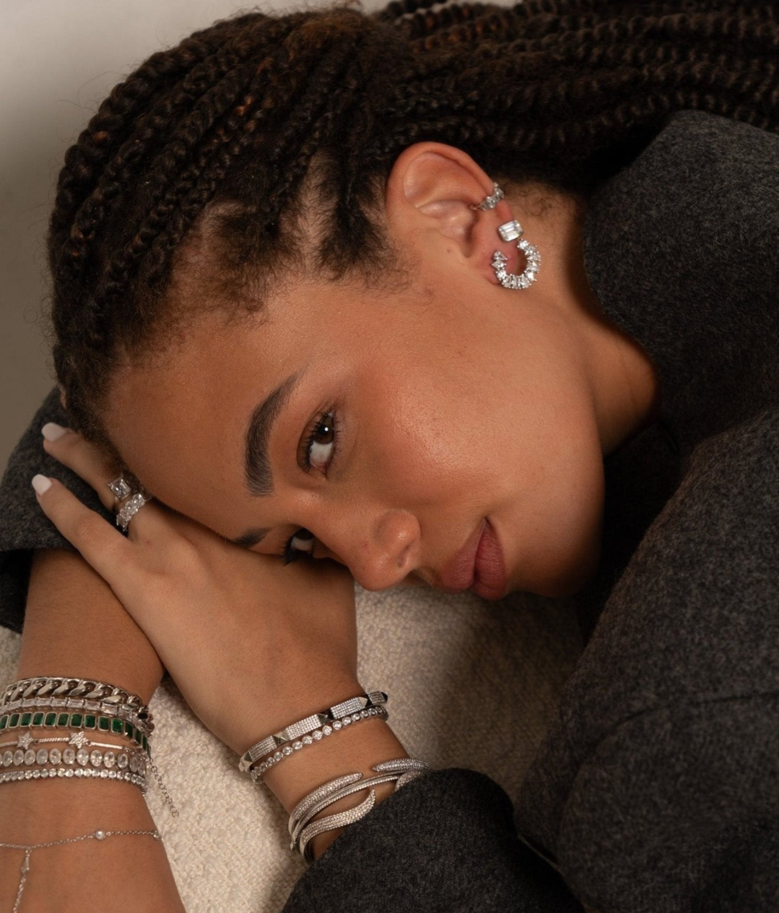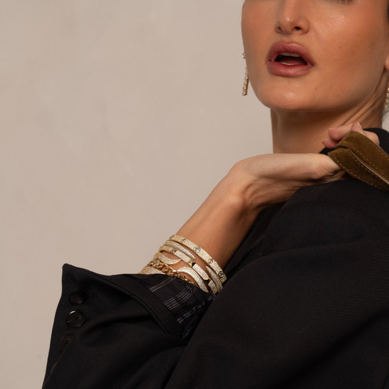 This pave studded oval shape bangle is the perfect accessory for adding a tough of glamour to any outfit.  The bangle features a sparkling array of pave set cubic zirconia stones with studs in between.  This bangle is perfect for both casual and formal.  Can be worn alone or added to your stack!  Hinge closure makes it easy for on and off wear.