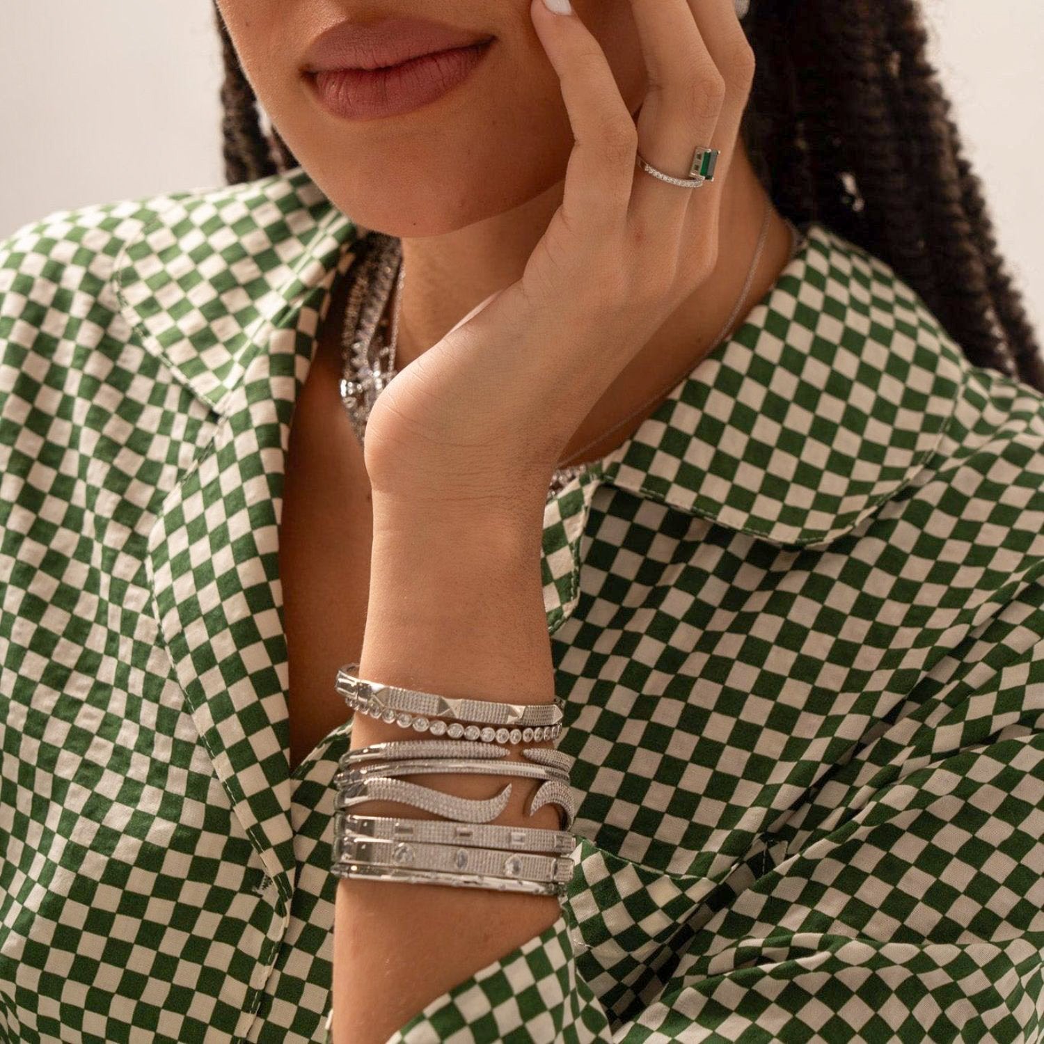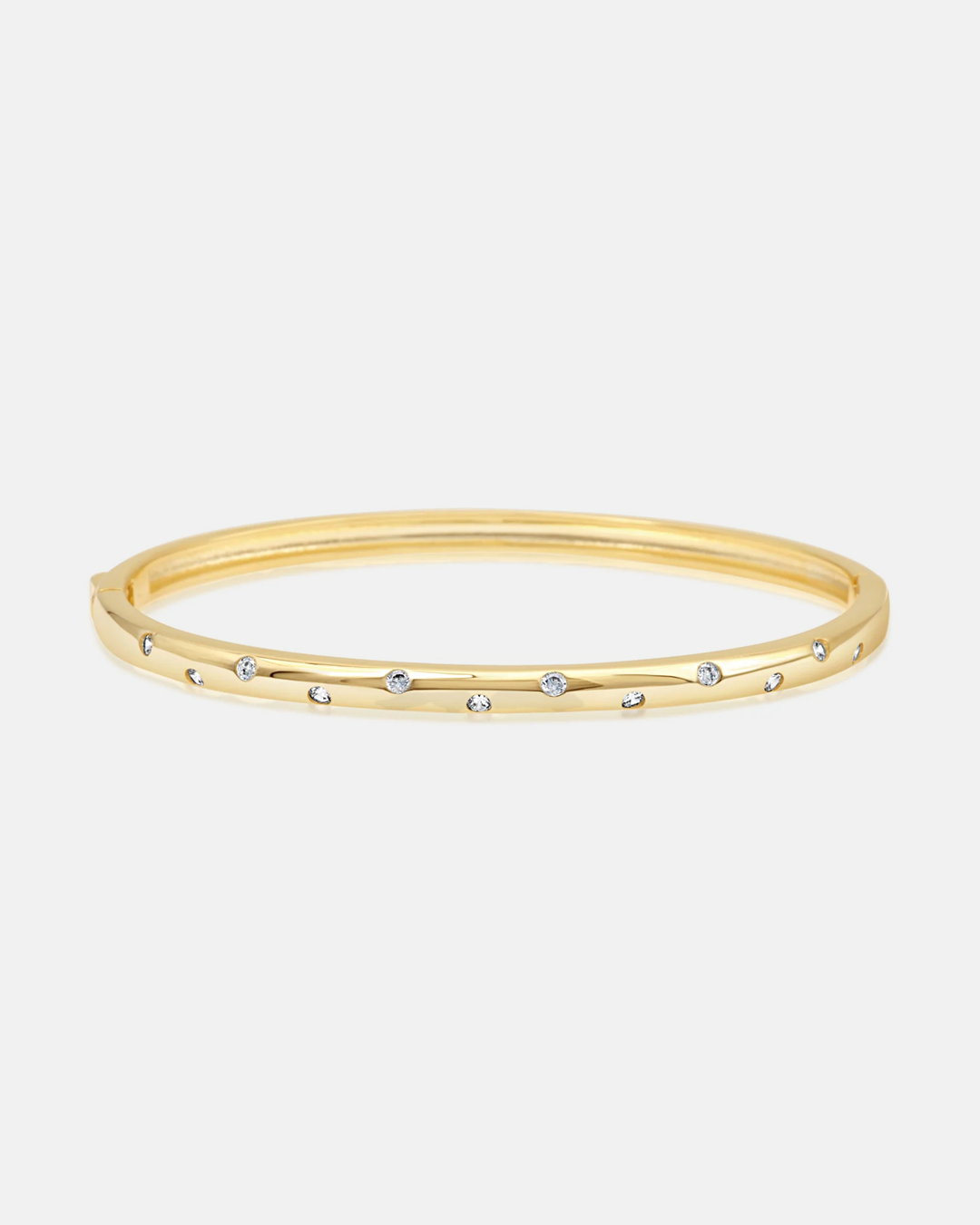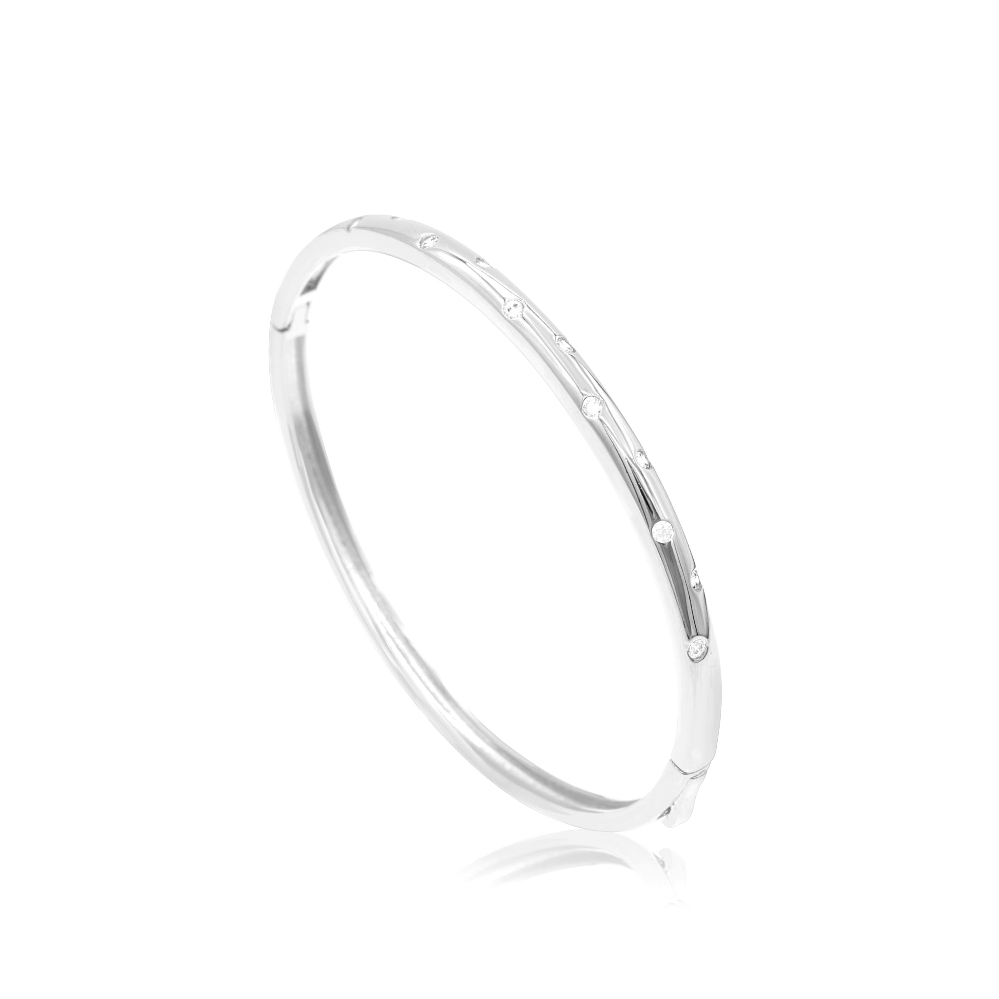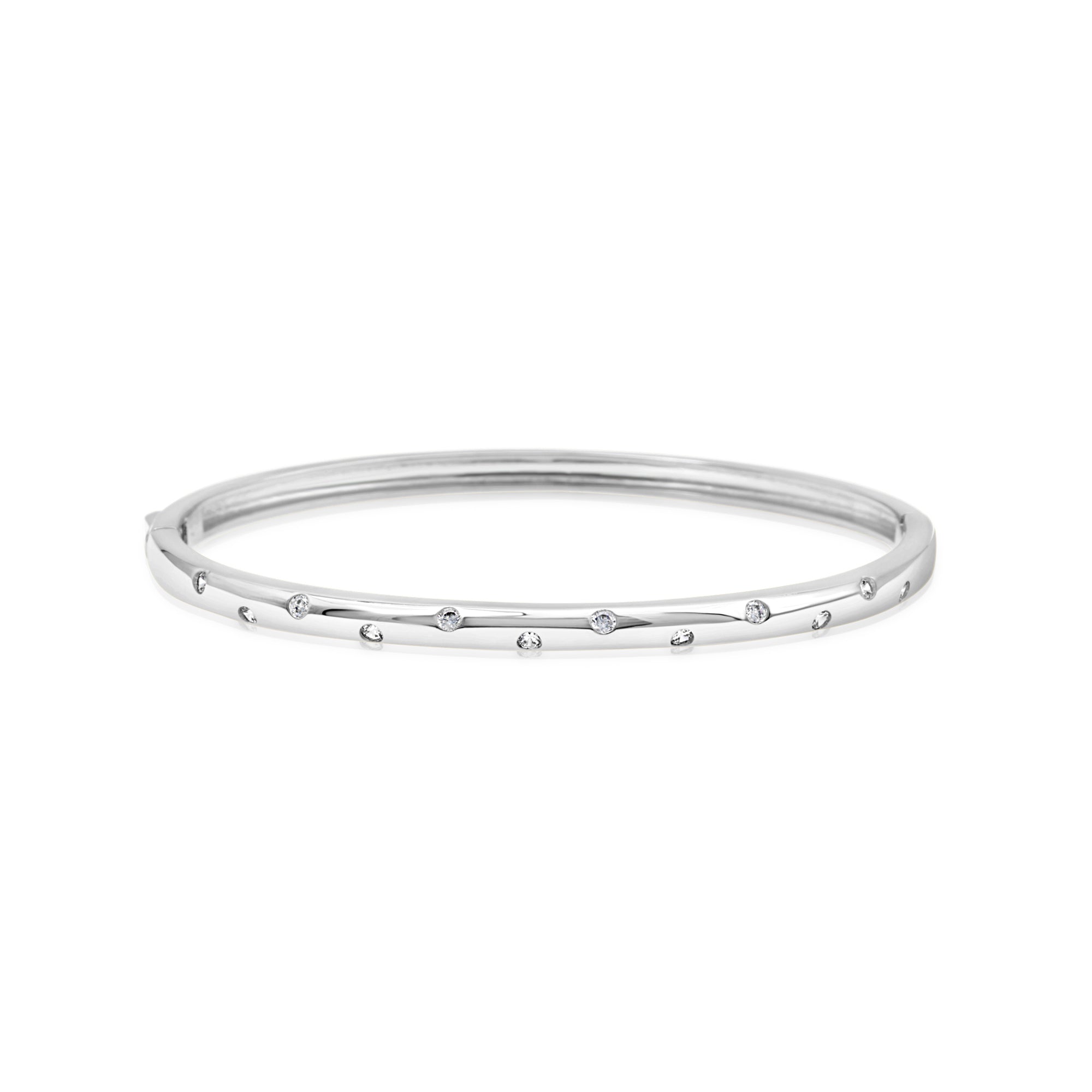 This Scattered Stone Bangle is a modern and stylish accessory, with its rounded-edges oval shape and scattered stones. Its sleek design makes it the perfect addition to any stack of bracelets and bangles.