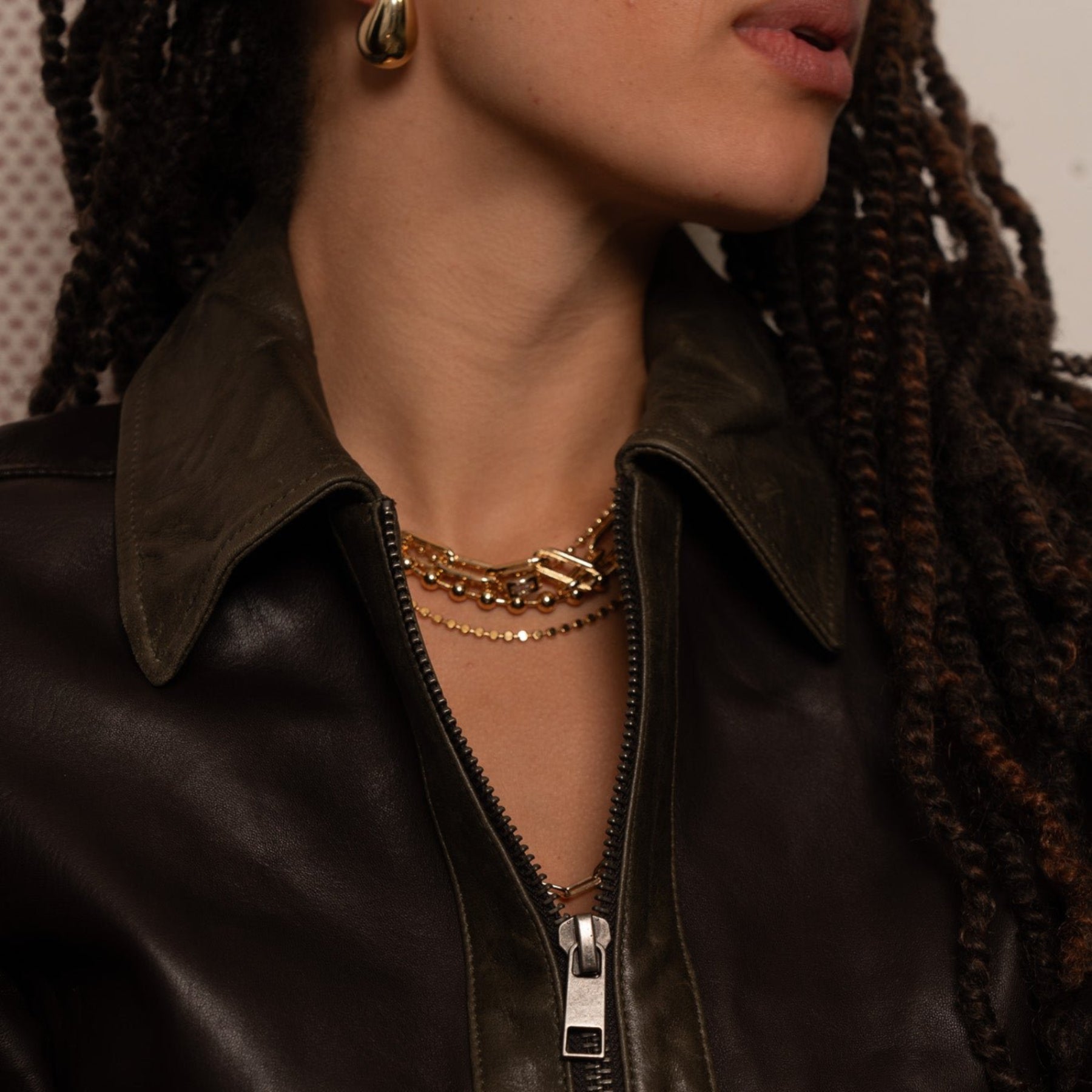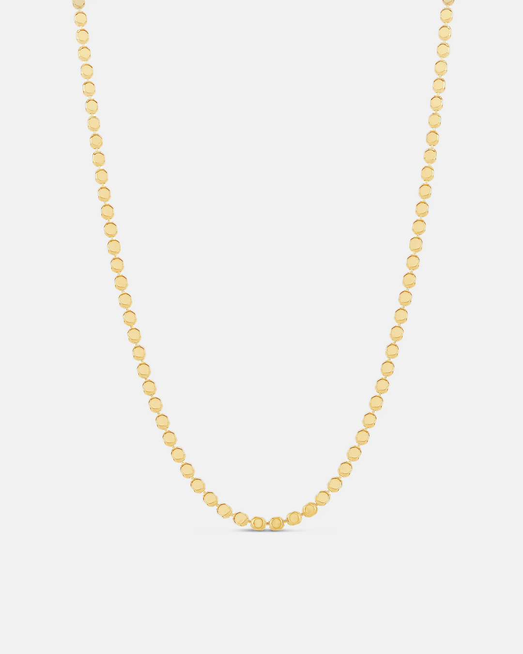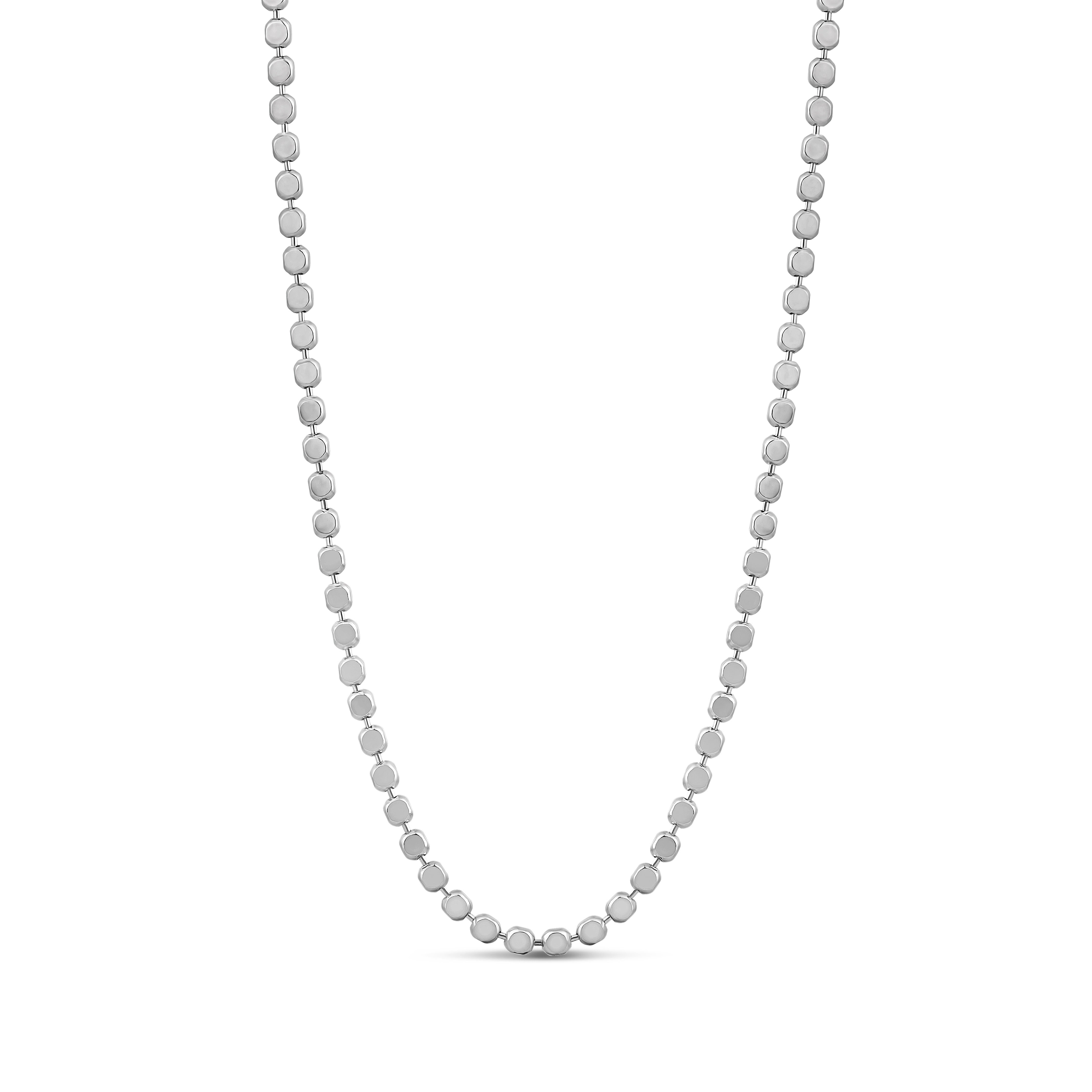 This Thin Dot Chain presents a flat ball chain design, perfect for accentuating any ensemble. An eye-catching style can be achieved by wearing it alone or in combination with other chains. Your new favorite go to chain!