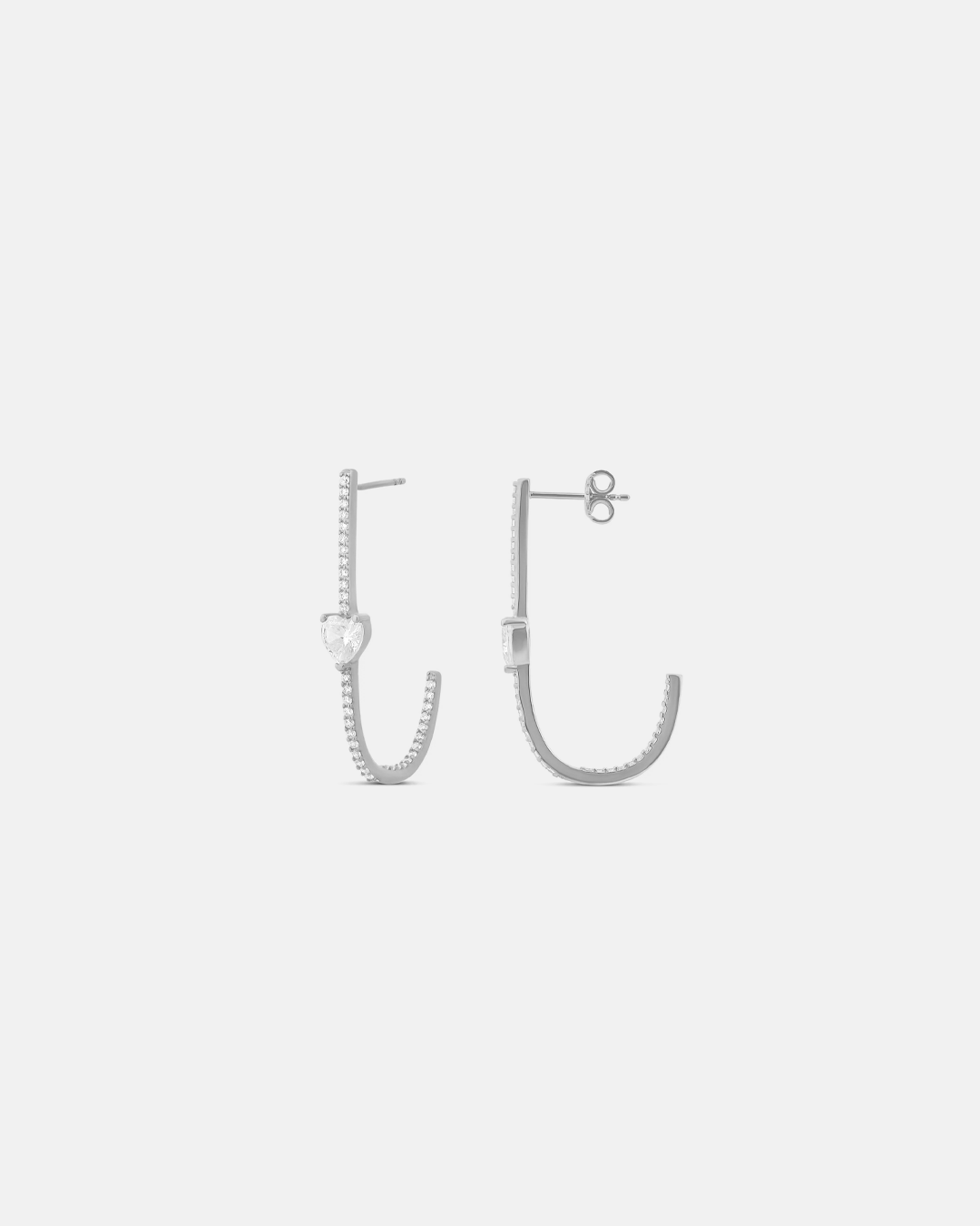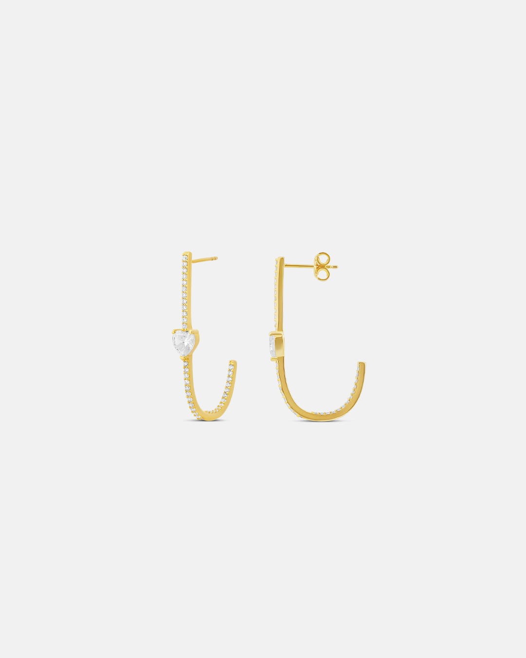 Introducing our stunning Pave J Hoop earrings. These J shape pave hoop earrings have been elevated with a sparkling center heart stone. These earrings are perfect for adding a touch of modern elegance and sparkle to any outfit. Perfect for day or night. A great gift for yourself or anyone that loves hoops and hearts.