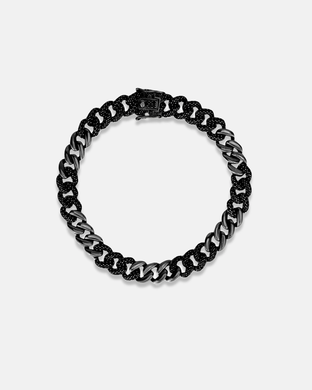 This Black Rhodium Men's Cuban Bracelet is a timeless piece of jewelry, featuring a sophisticated mens look. Expertly crafted with a solid mixture of pave and rhodium elements, it's a stylish and sleek accessory for any wardrobe.