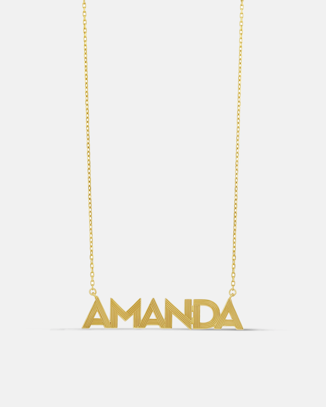 This Personalized Fluted Name Necklace showcases your name in striking uppercase block letters, offering a clean and modern look. Expertly crafted for durability and style, it provides a distinctive way to wear your identity or celebrate a loved one. Ideal for layering or as a standalone statement piece, it combines personalization with timeless elegance.