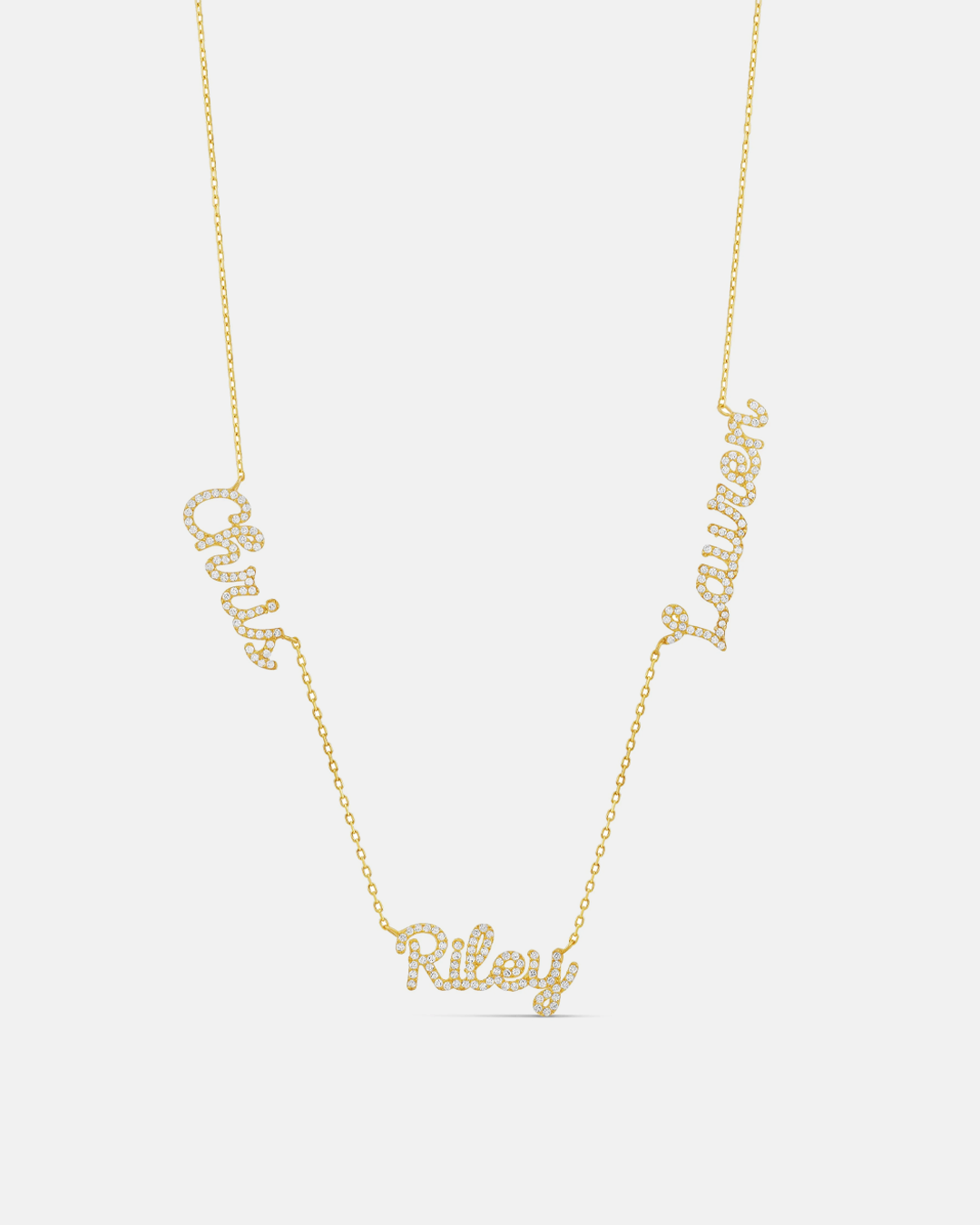 Showcase your individuality with this Personalized Pave Cursive Name Necklace. Crafted with custom names in graceful cursive and adorned with sparkling pave letters, it offers a unique, eye-catching design that’s perfectly on trend. Stand out effortlessly with this elegant and meaningful accessory.