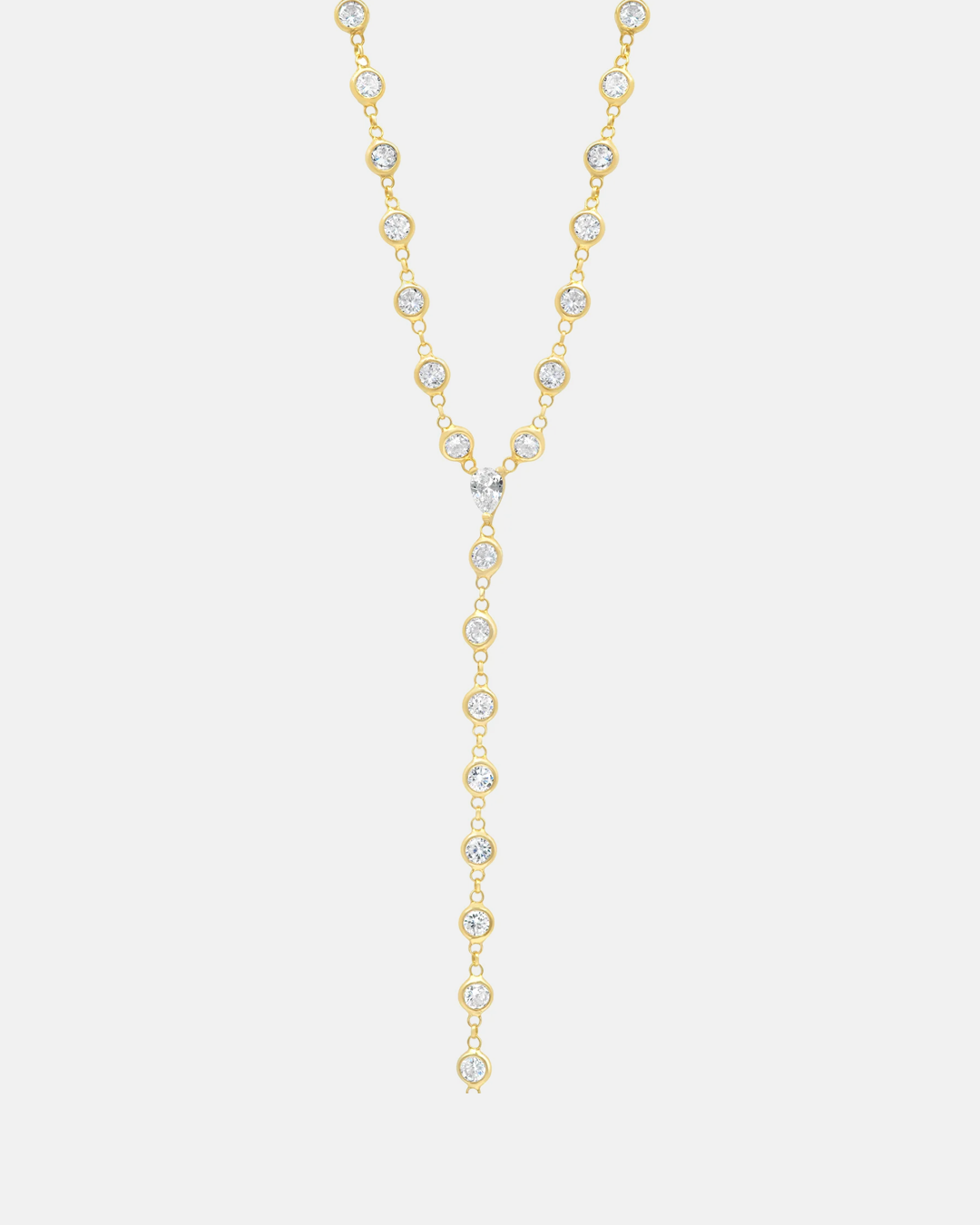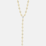 This Round Bezel Lariat is a stylish and versatile addition to any wardrobe. The stunning bezel set round shape is perfect for elegant evening outfits, but its design also allows for fun, everyday layering options. Make a statement with this must-have accessory!
