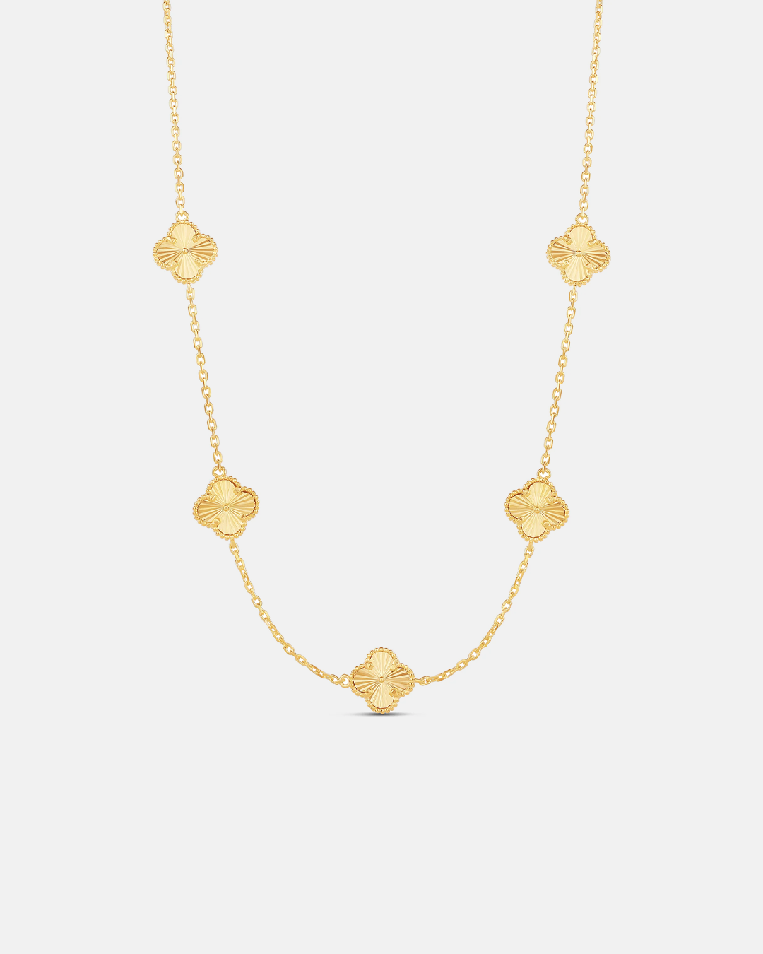 Upgrade any outfit with our gorgeous Multi Large Fluted Clover Necklace. The delicate, fluted chain necklace adds a touch of sweetness and can be dressed up for a night out or layered for a trendy look. From jeans and a t-shirt to an evening gown, this necklace will bring a touch of elegance to any ensemble.