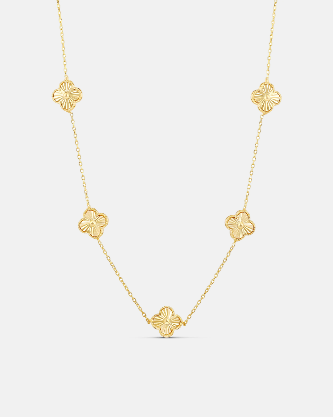 Upgrade any outfit with our gorgeous Multi Mini Fluted Clover Necklace. The delicate, fluted chain necklace adds a touch of sweetness and can be dressed up for a night out or layered for a trendy look. From jeans and a t-shirt to an evening gown, this necklace will bring a touch of elegance to any ensemble.