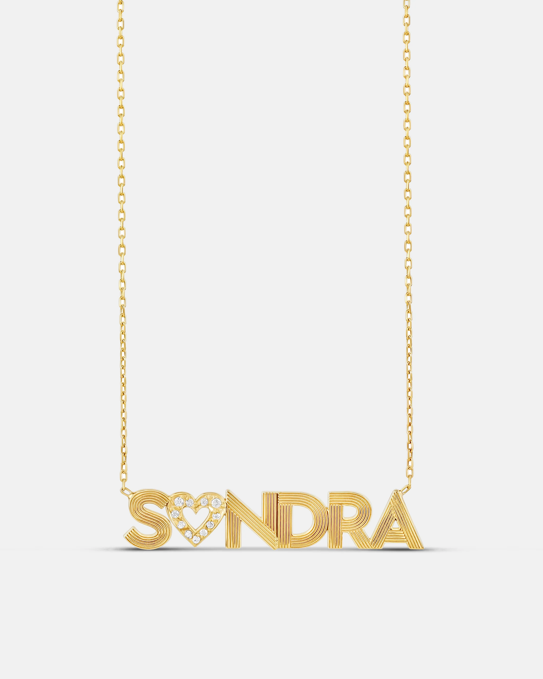 Add a touch of charm with this Personalized Pave Heart and Fluted Name Necklace. Featuring a sparkling pave heart delicately placed by the designer to perfectly complement your unique name’s flow, this playful piece shines with personality. It’s a fun, stylish way to wear your name close to your heart.