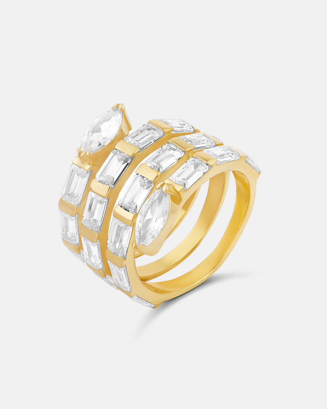 This stunning Baguette Statement Swirl Ring is sure to turn heads with its unique design. Crafted of sleek sterling silver with baguette cut stones, it provides an exquisite look that will leave you the center of attention. Make a statement with this chic, yet timeless piece.