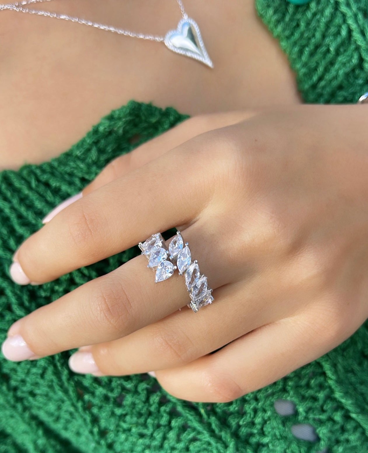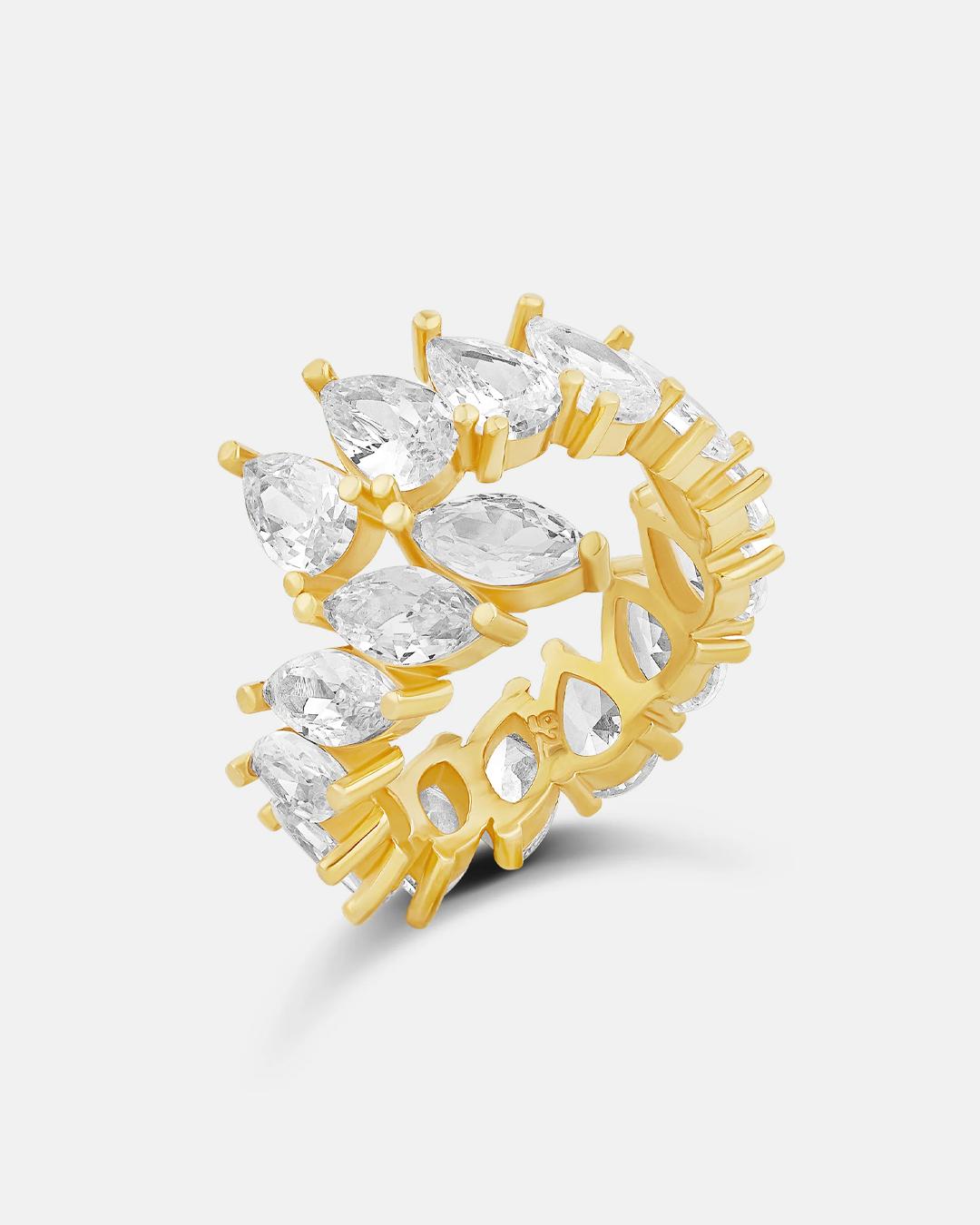 This gorgeous Marquise & Pear Shaped Wrap Statement Ring carries a striking look that is perfect for day or night. Its marquise and pear shape construct lends itself to an eternity band with a twist, making it a timeless and elegant accessory.