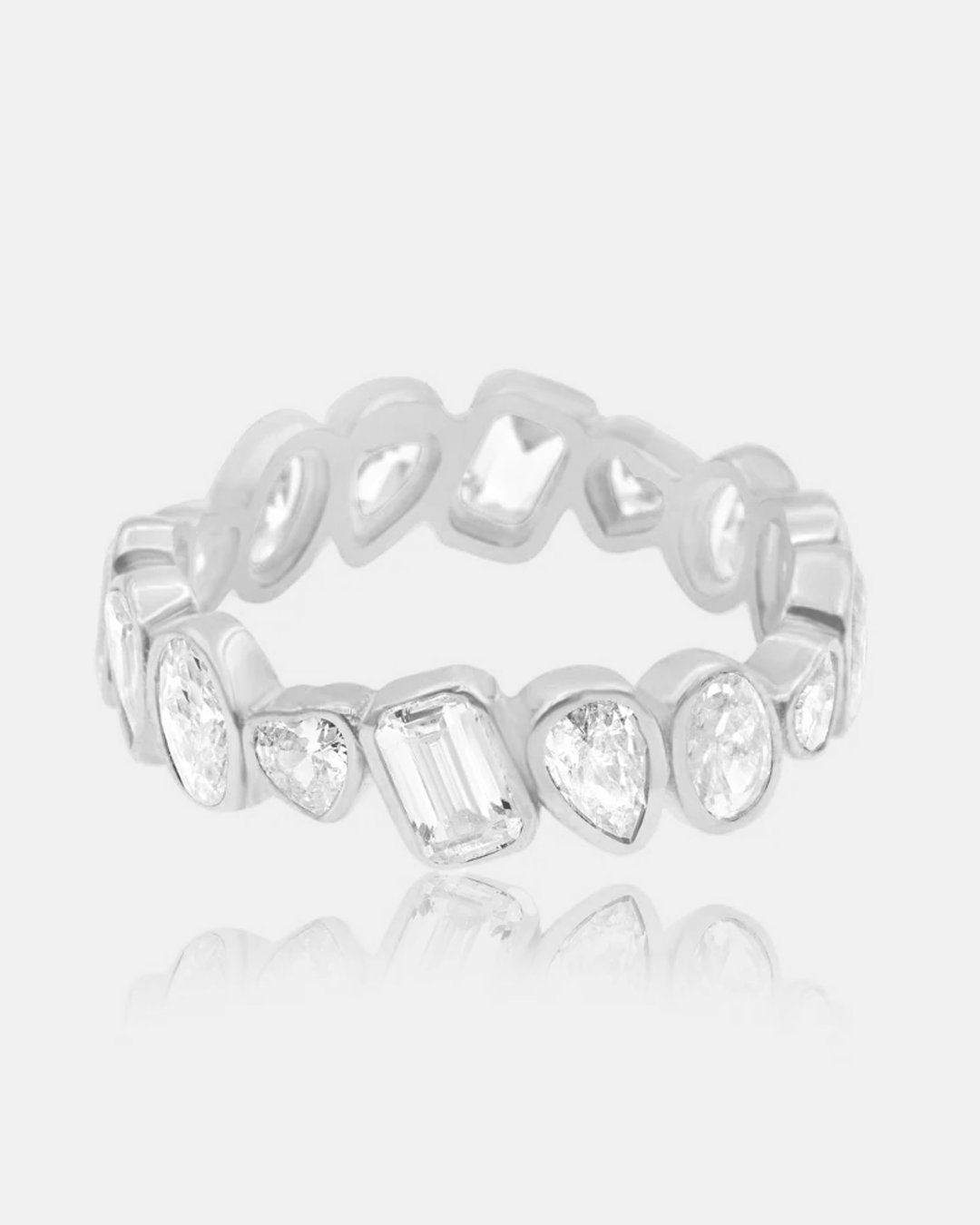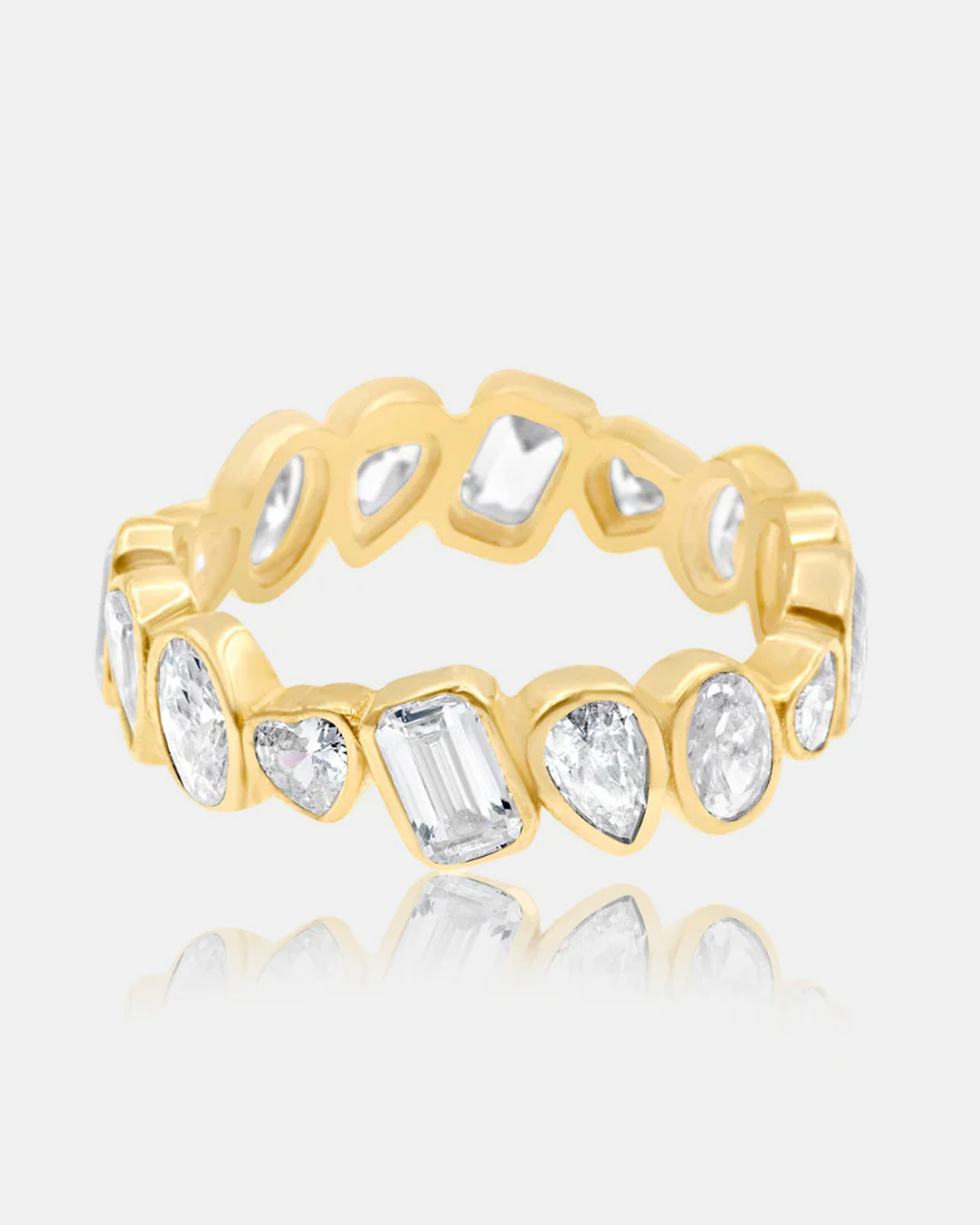 Elevate your style with our Mixed Shape Bezel Set Eternity Band. Featuring a stunning array of multi-shaped bezel set gems, this band adds a touch of unique elegance to any outfit. Perfect for day or night, it's the ultimate accessory for a polished and sophisticated look. FINAL SALE!