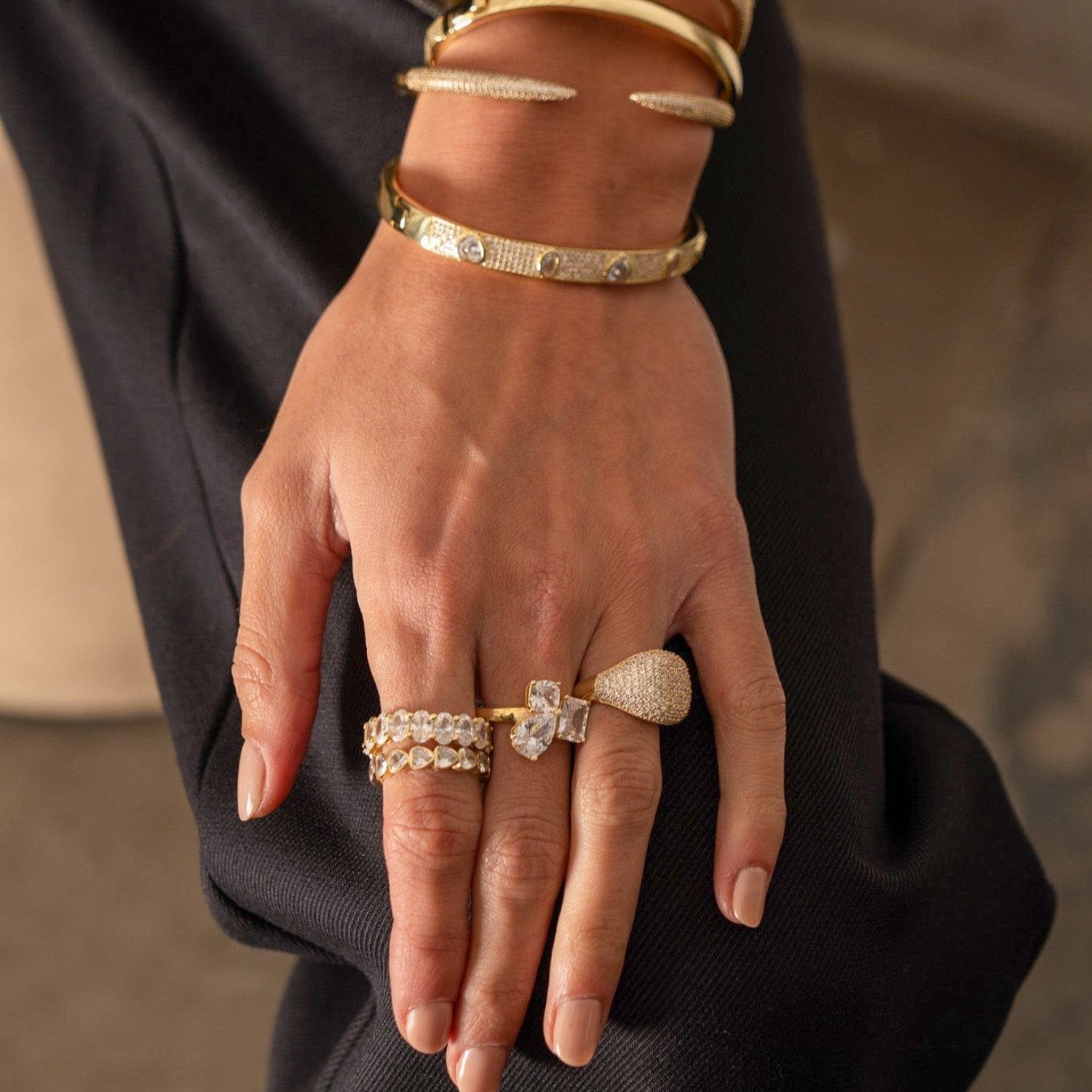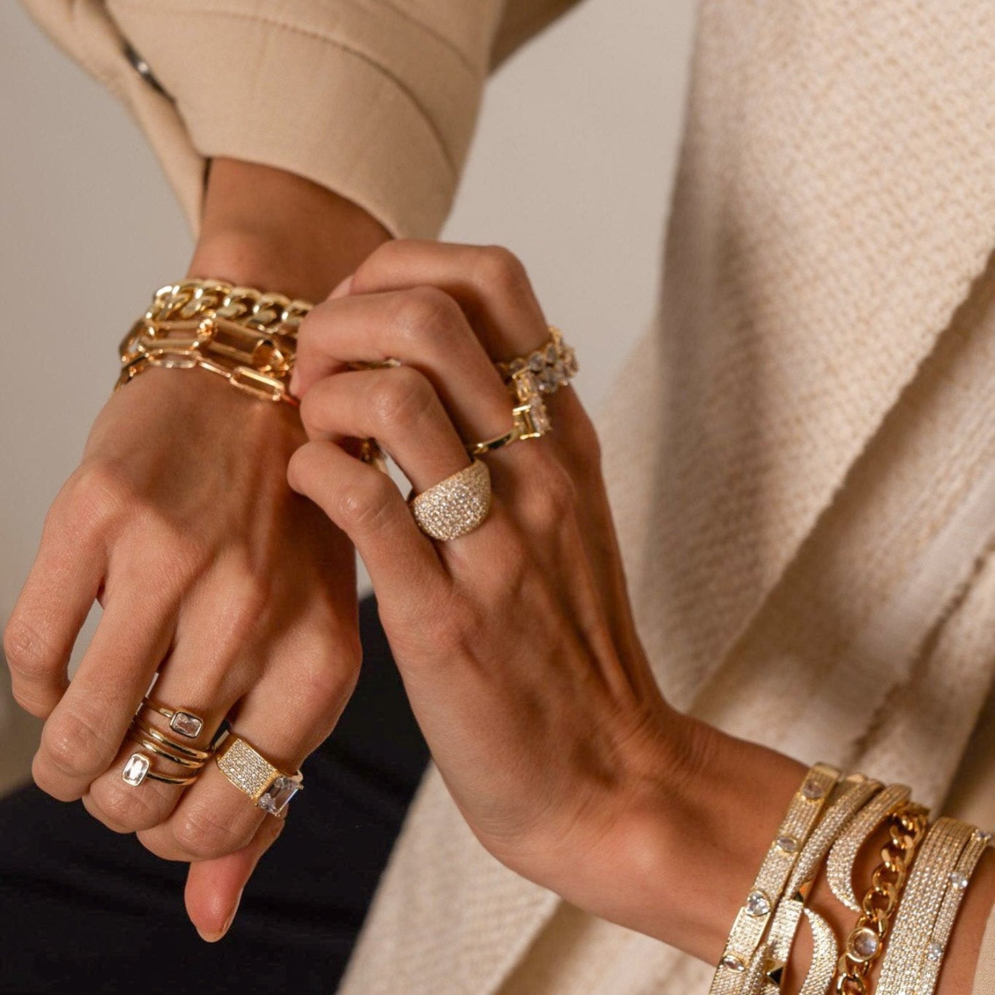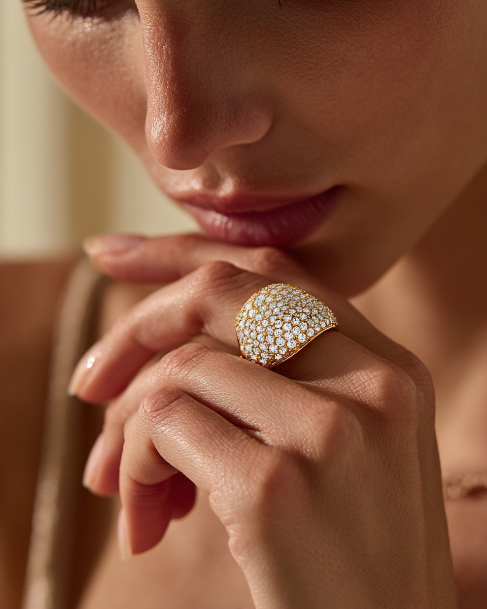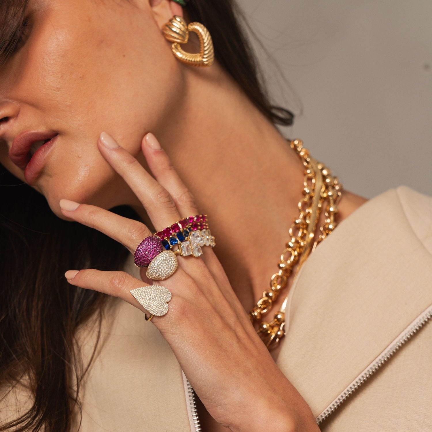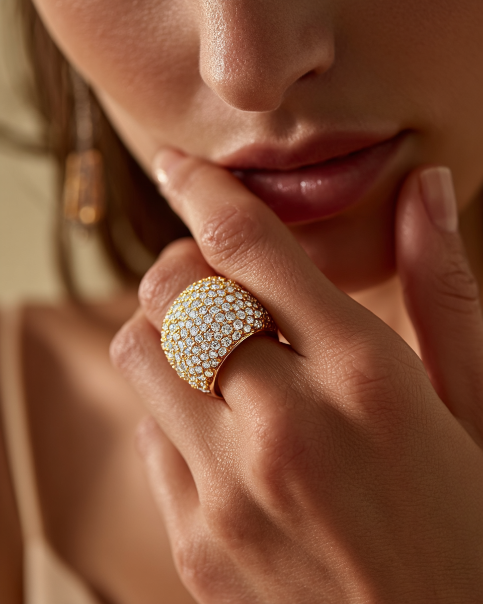 Elevate your style with our stunning Pave Signet Ring. Its gorgeous dome-like shape and statement-making pave design make it the perfect addition to any outfit, day or night. Let this ring make a statement and elevate your look.