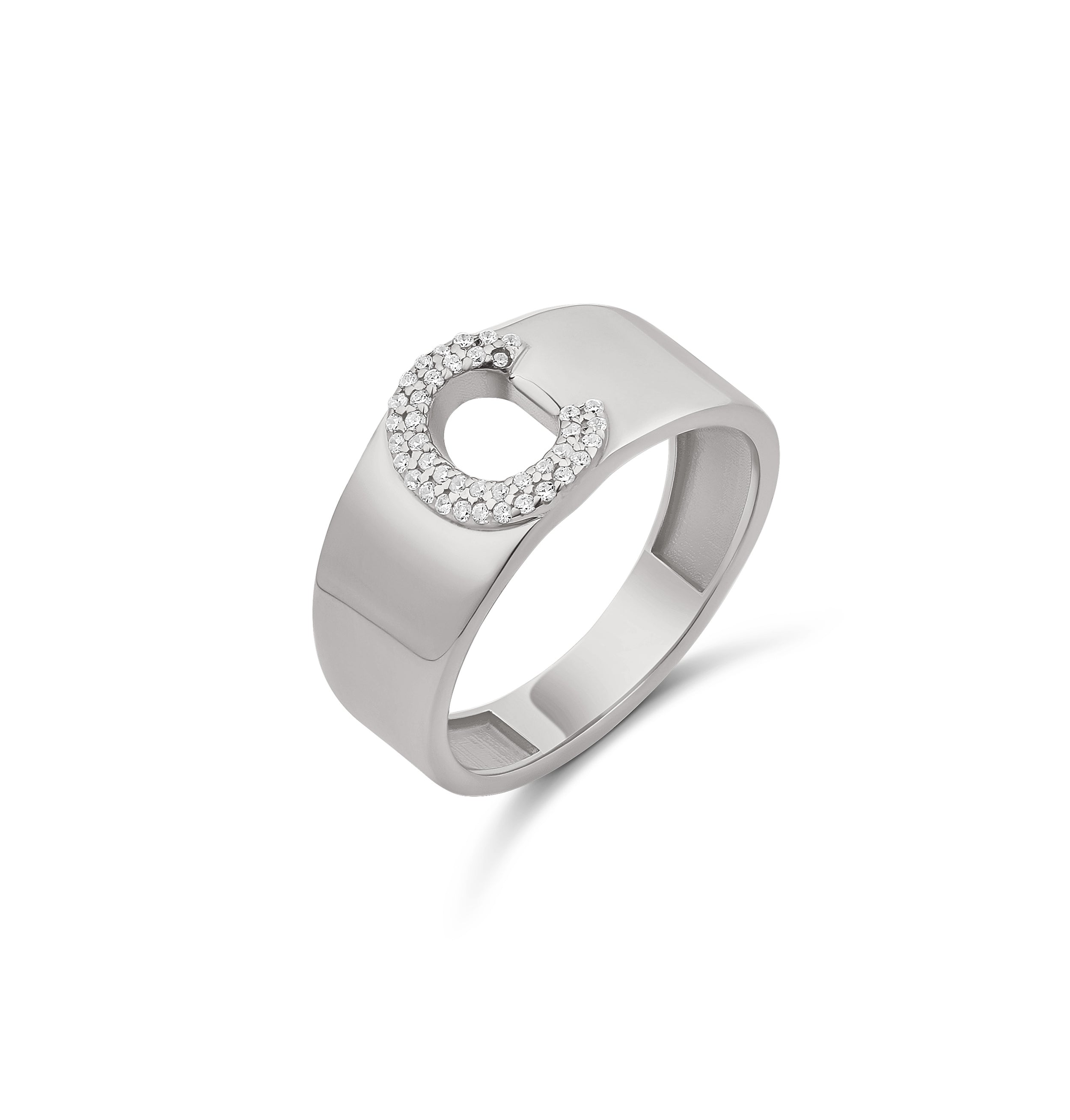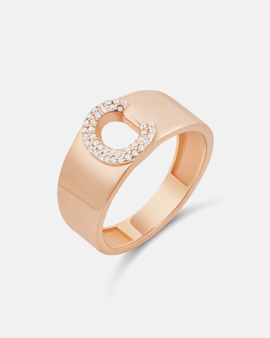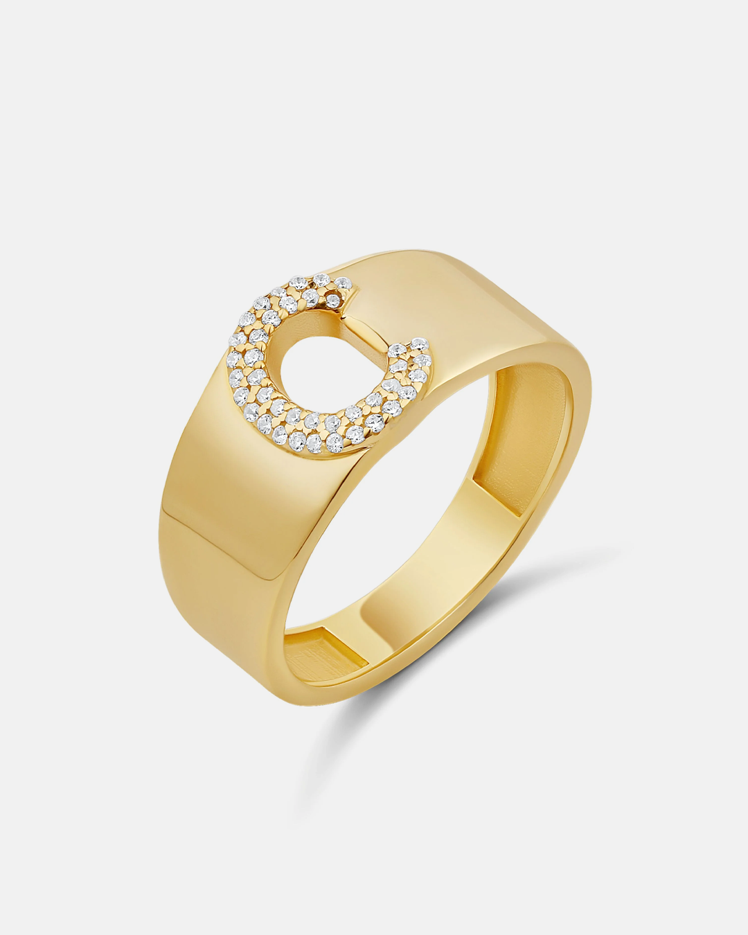 Command attention with the Personalized Wide Pave Initial Ring. This bold, wide band ring is adorned with shimmering pave stones that beautifully frame your chosen initial, creating a personalized statement piece. Perfect for adding a touch of boldness and individuality to any outfit, this ring combines standout style with meaningful customization. Make your signature shine with this must have ring.