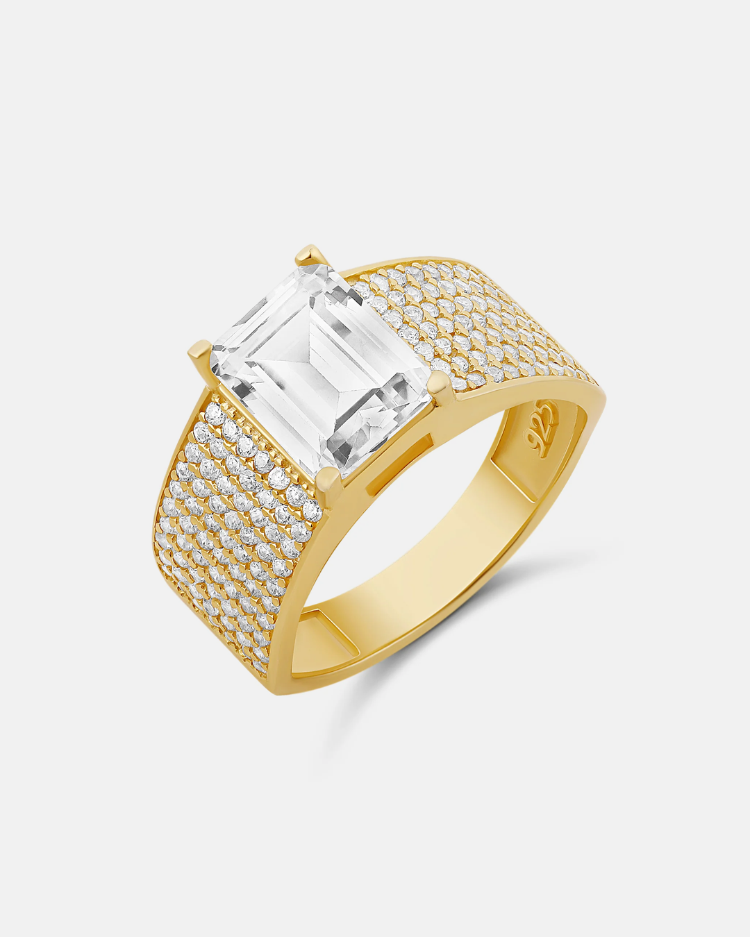 Introducing our Wide Pave Center Stone Band, a must-have for any jewelry collection. Featuring a prong-set emerald center stone, complemented by pave stones encircling half of the band, this stunning statement piece is perfect for any occasion, day or night. Elevate your style with this elegant design.