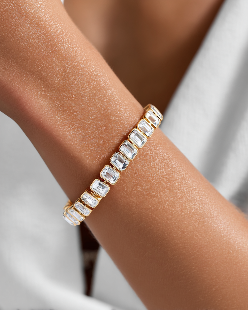 This gorgeous Bezel-Set Emerald Tennis Statement Bracelet will be sure to turn heads whenever you have it on. Featuring large emerald cut bezel set stones, it will provide the bold statement you desire. With its luxurious and stunning look, this bracelet is sure to get tons of compliments and look like a million bucks. The Bezel-Set Emerald Tennis Statement Bracelet is the tennis bracelet of your dreams!