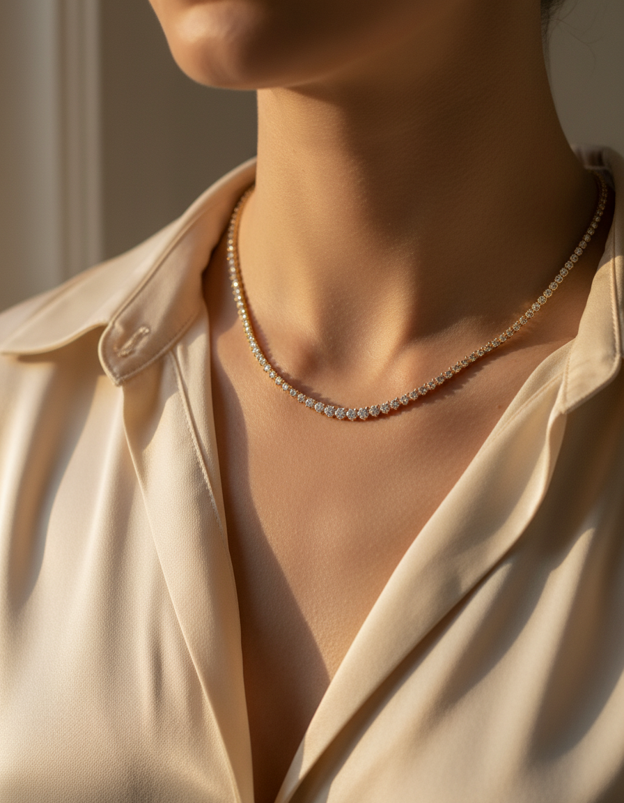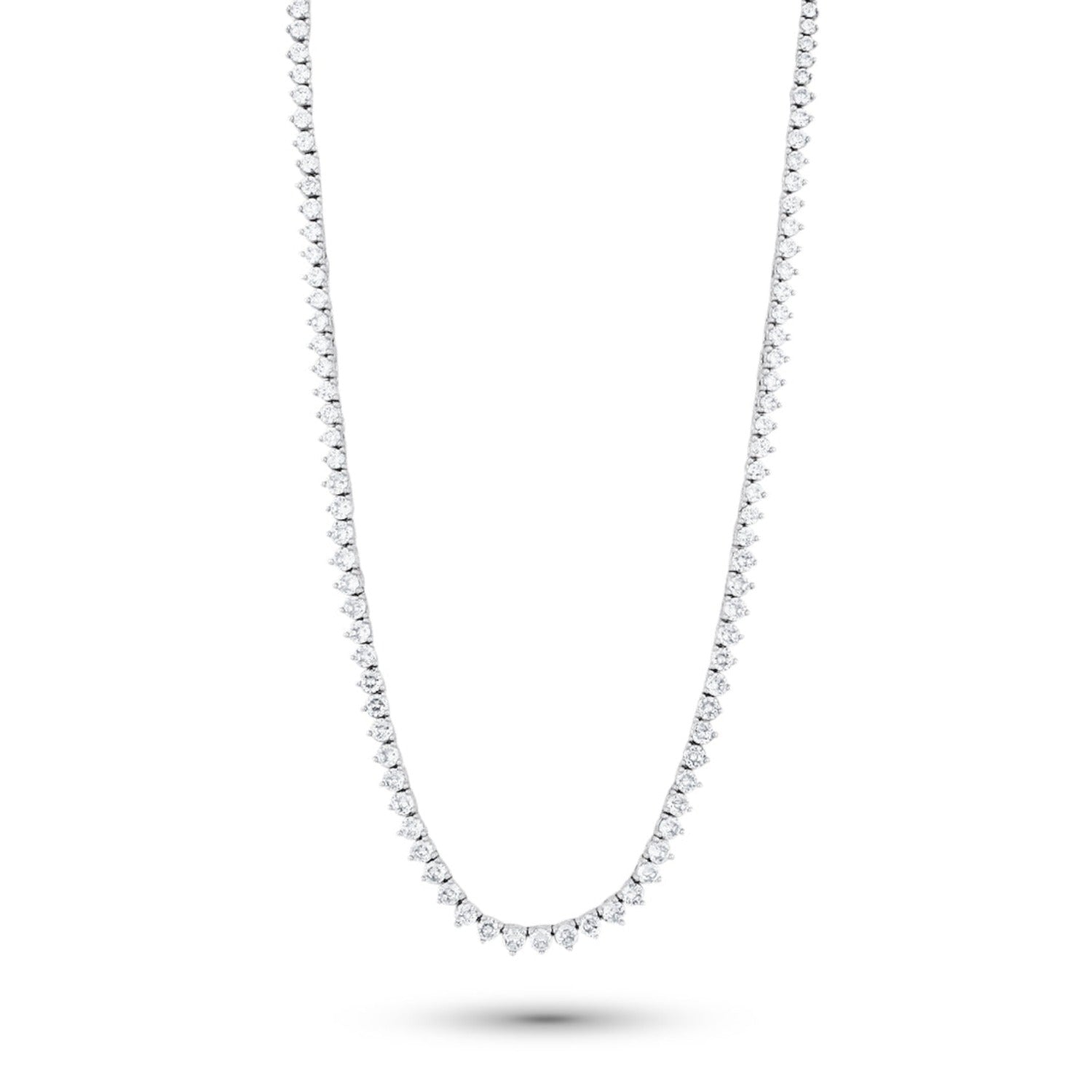 Elevate your style with our Three Prong Round Graduated Tennis Necklace. This modern twist on a classic staple is a must-have in your jewelry box. With its timeless design, it can be easily paired with any outfit for a sophisticated look. Don't miss out on this versatile and on-trend piece.