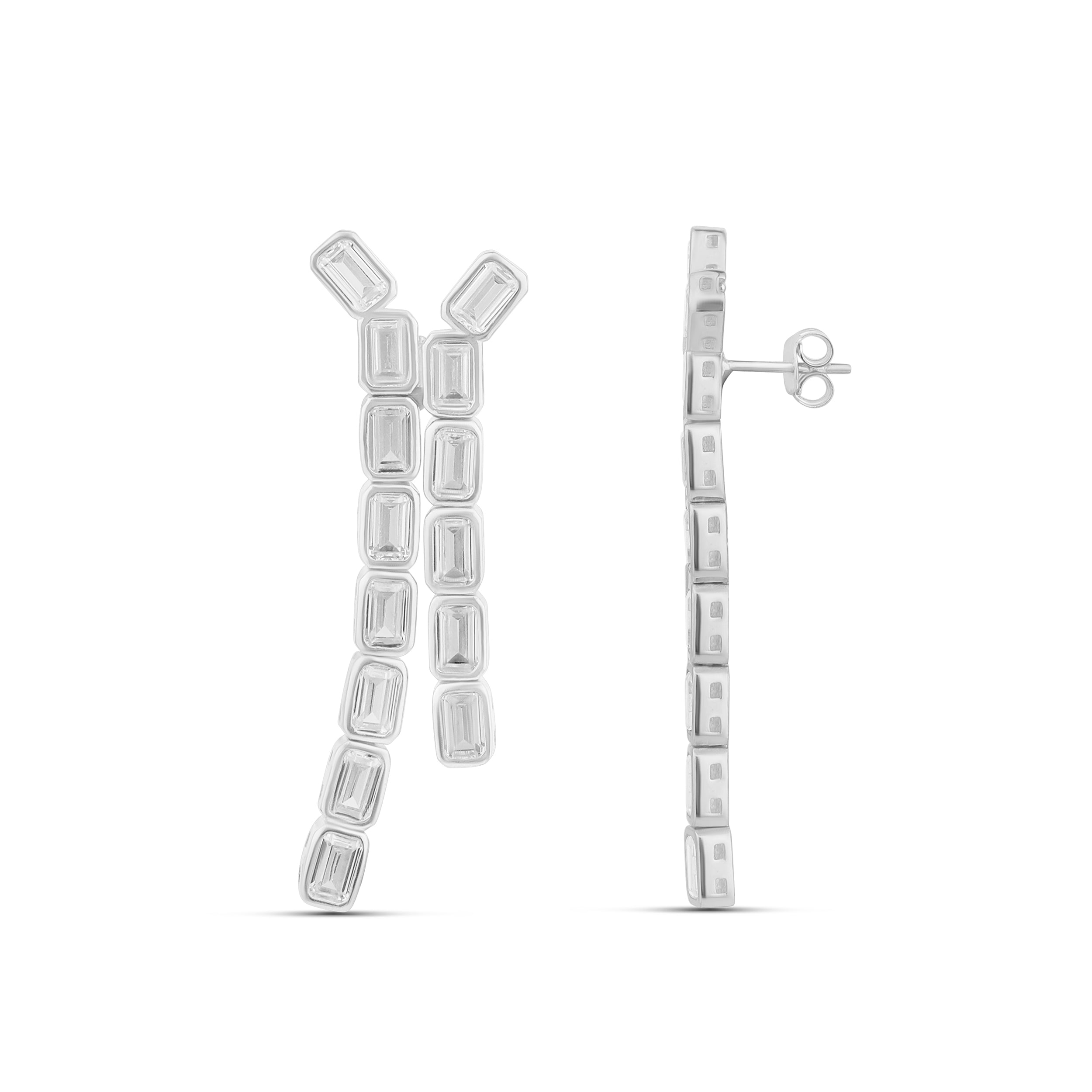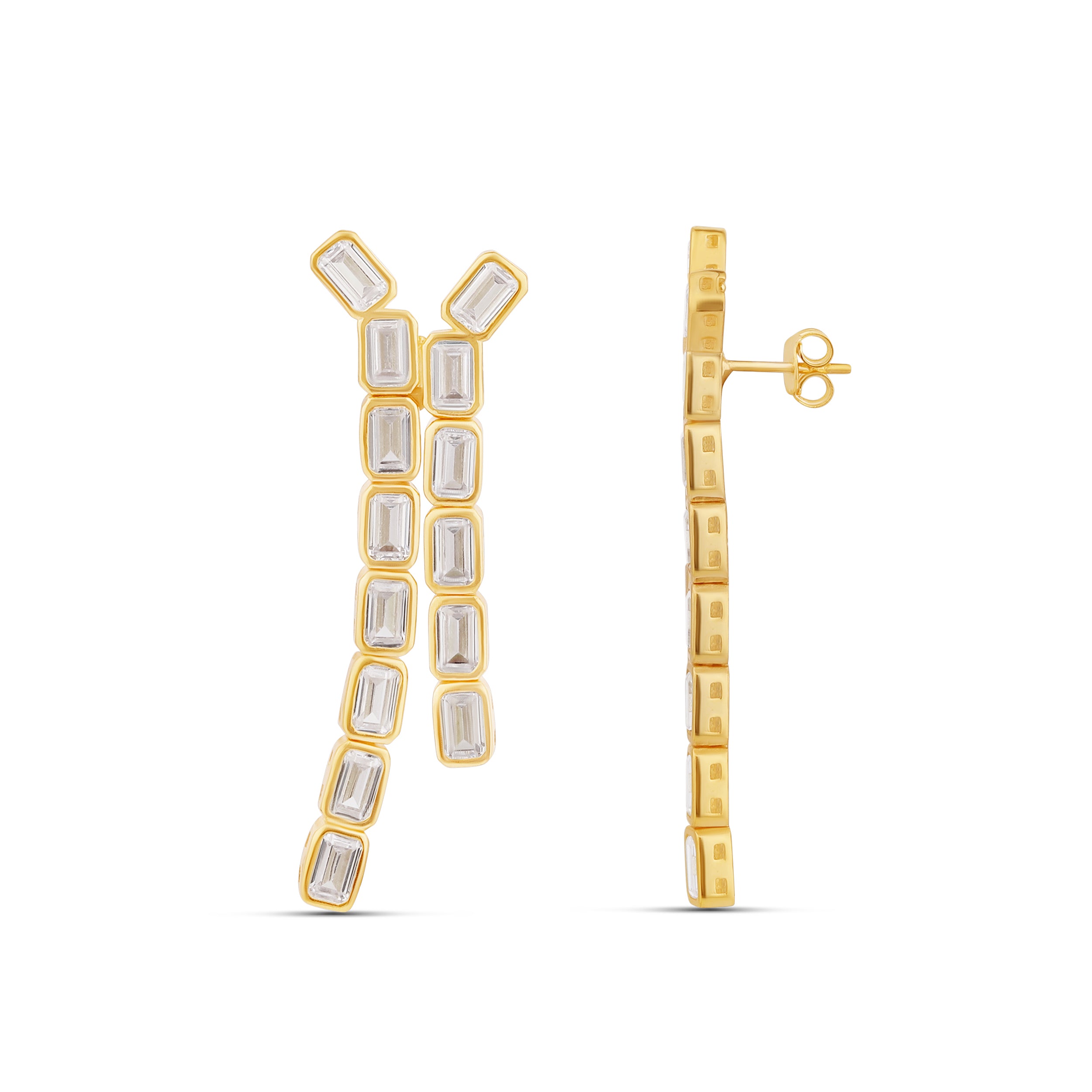 Sleek, chic, and effortlessly striking, these Bezel Set Emerald Statement Earrings are designed to turn heads. A row of emerald-cut stones set in smooth bezels creates a clean, modern line of brilliance that catches the light with every movement. Their elongated silhouette feels bold yet refined, adding just the right amount of drama to any look. Pair them with the matching necklace for a polished set, or wear them on their own when you want a little extra sparkle. Modern, elevated, and made to stand out.