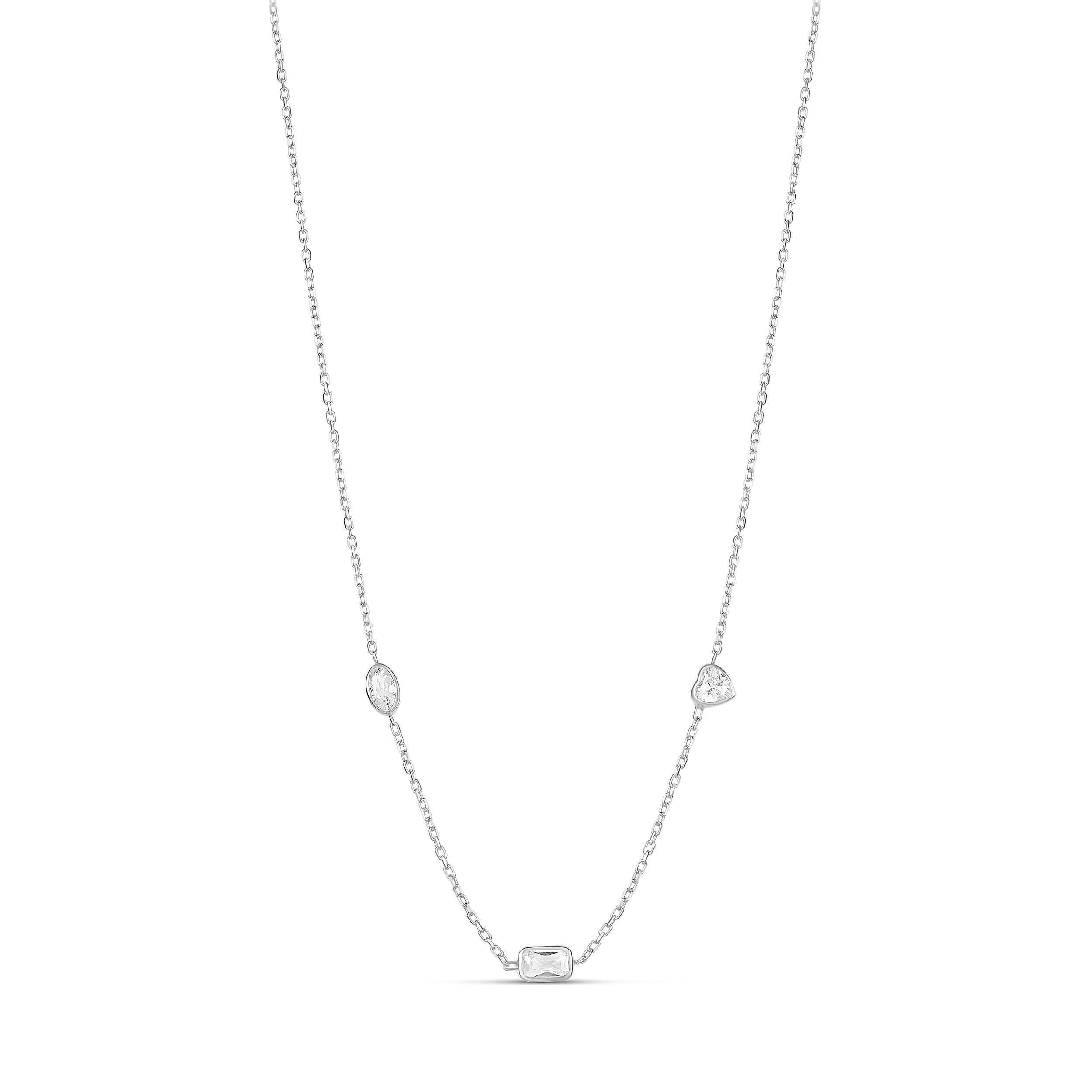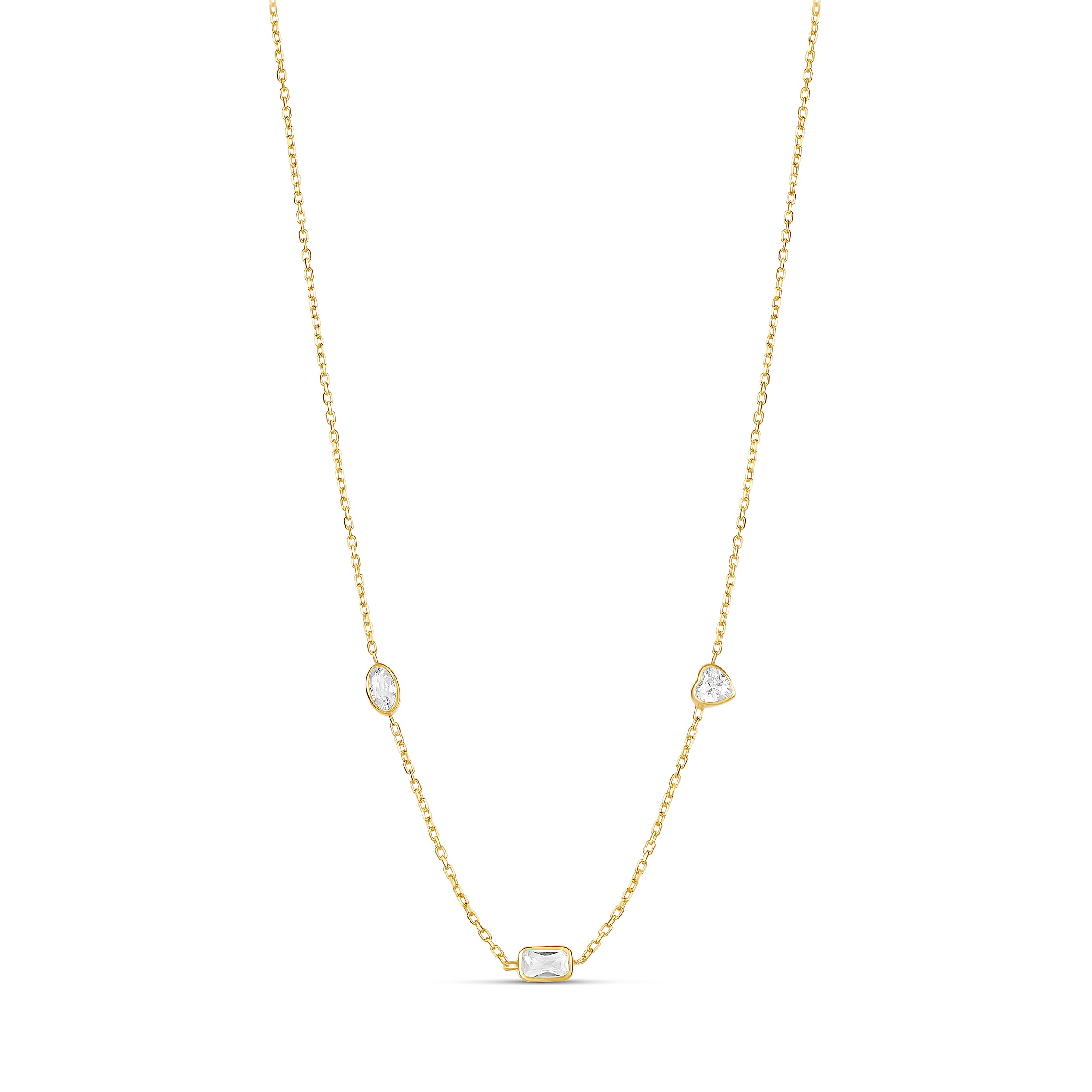 Our Multi Fancy Shape delicate necklace features three dainty shapes of heart, oval and emerald to create a beautiful layered look. This lightweight and delicate necklace is a perfect addition to any outfit.